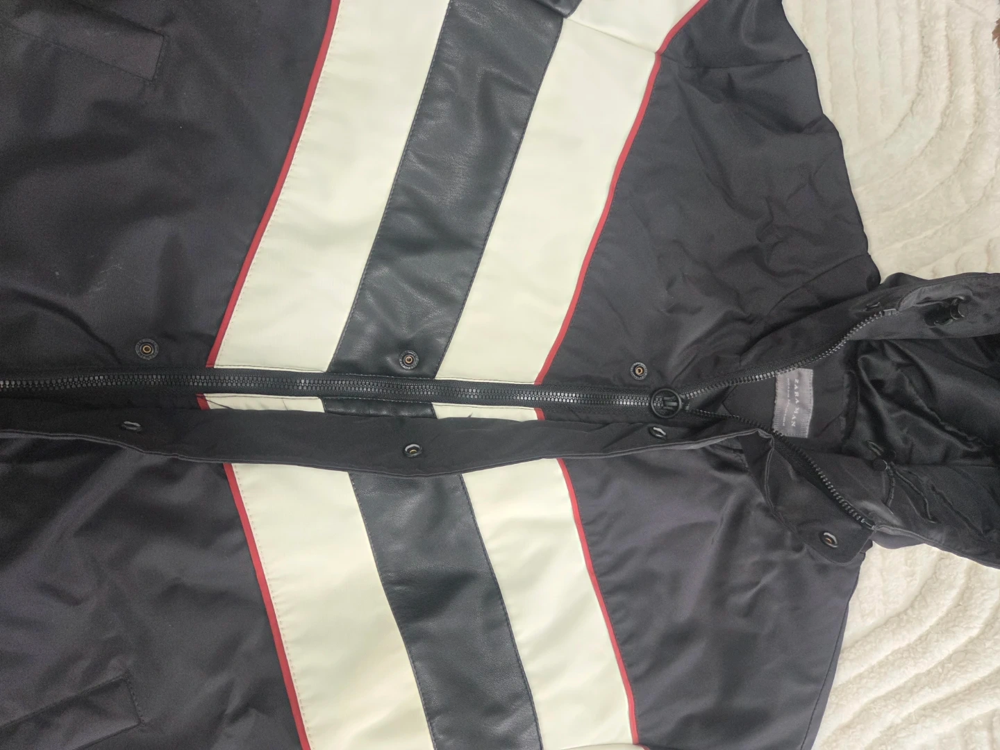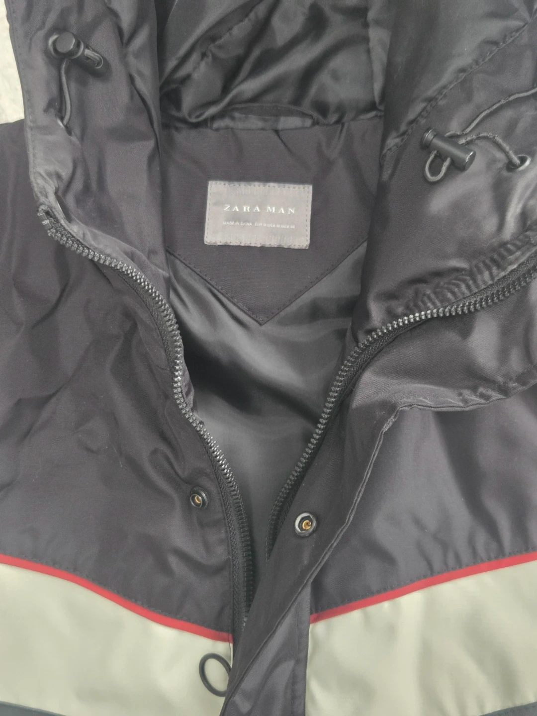 This is a Zara Man black jacket with white and red stripe accents. It features a full zip closure and a hood. The jacket has elastic cuffs and hem.