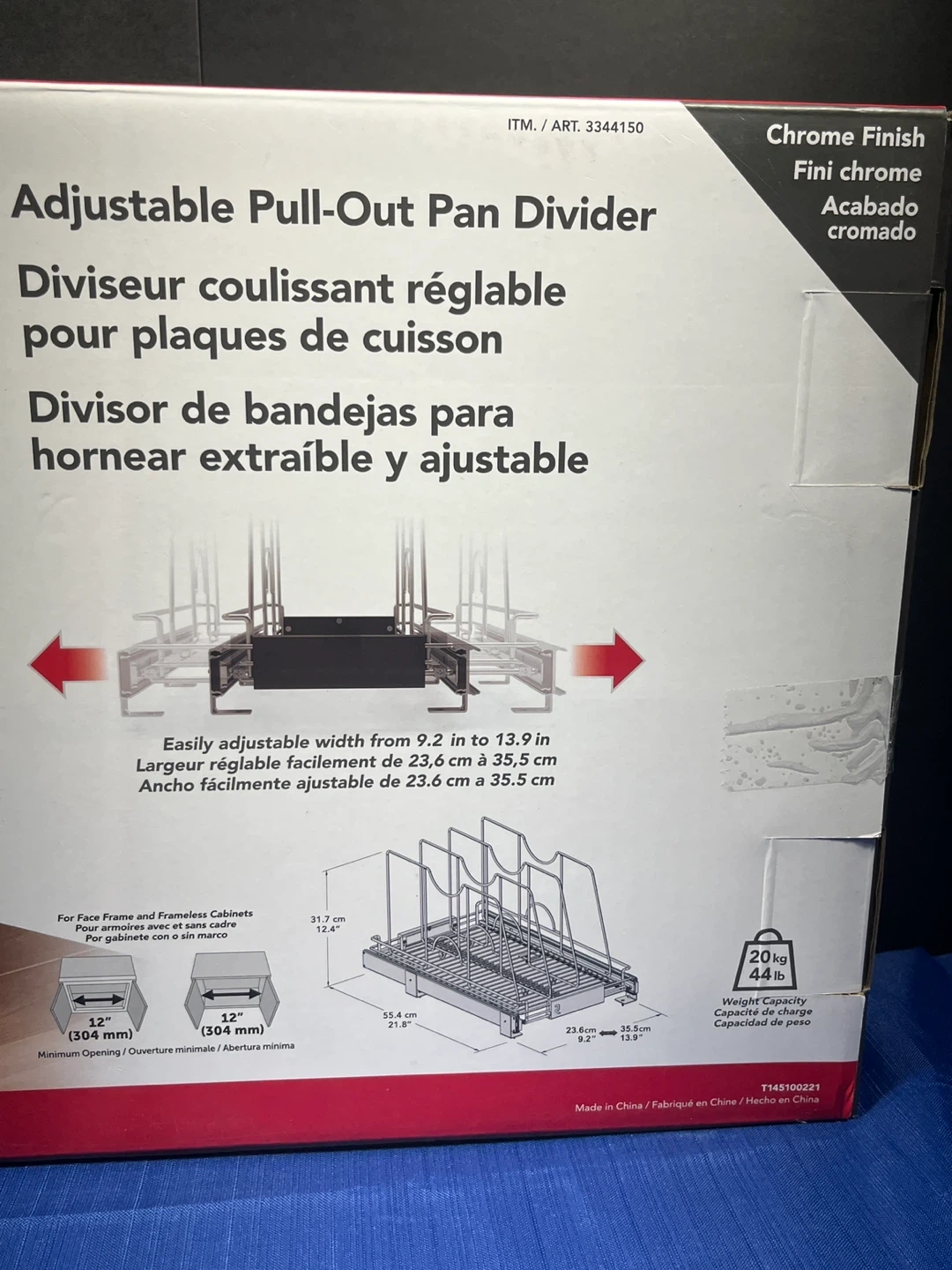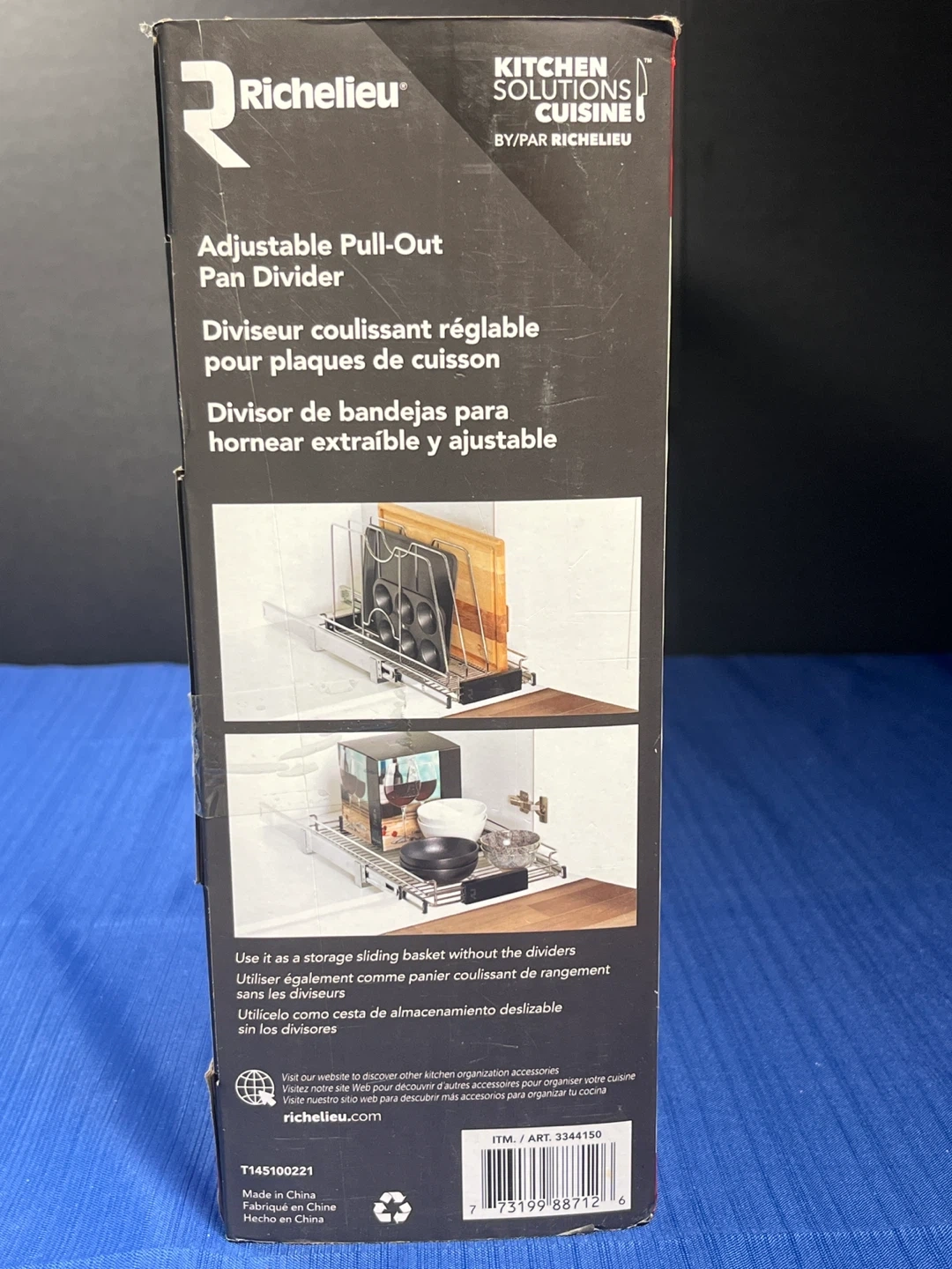 This is a Richelieu adjustable pull-out pan divider in a chrome finish. It's designed for kitchen solutions to organize baking sheets and cutting boards. The width is easily adjustable from 9.2 to 13.9 inches.