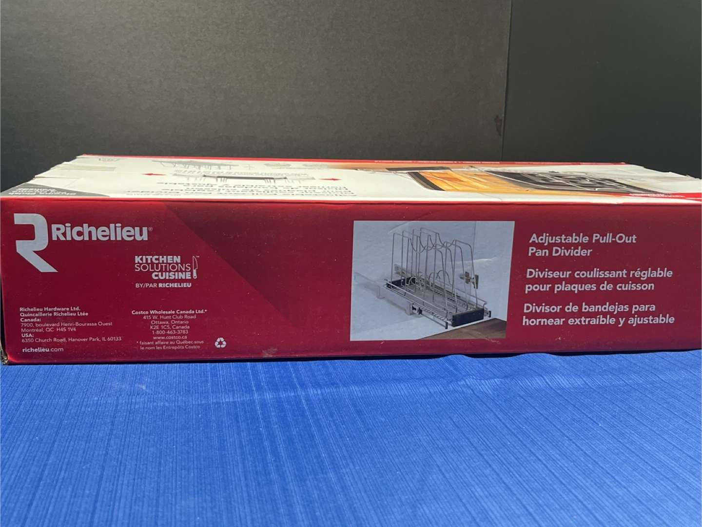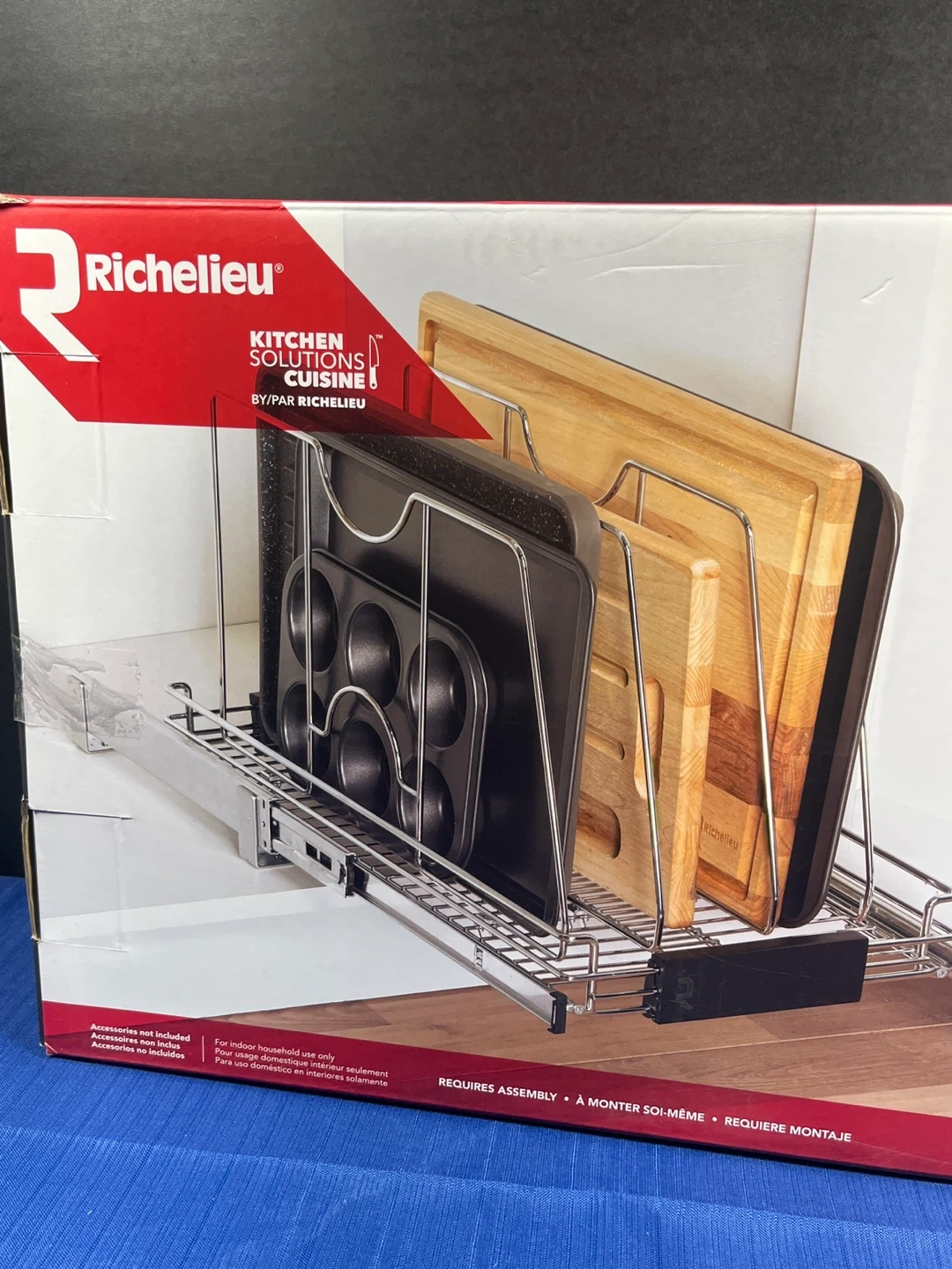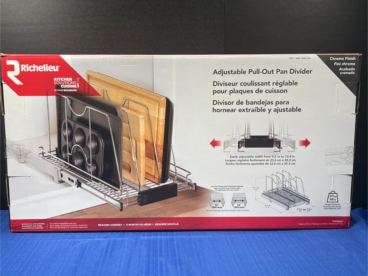 This is a Richelieu adjustable pull-out pan divider in a chrome finish. It's designed for kitchen solutions to organize baking sheets and cutting boards. The width is easily adjustable from 9.2 to 13.9 inches.