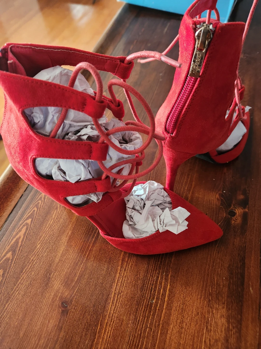 These striking red heels feature a suede-like material and intricate lace-up detailing. They're finished with a convenient side zipper for easy on and off. Suede-like material and synthetic sole. Perfect for a night out!