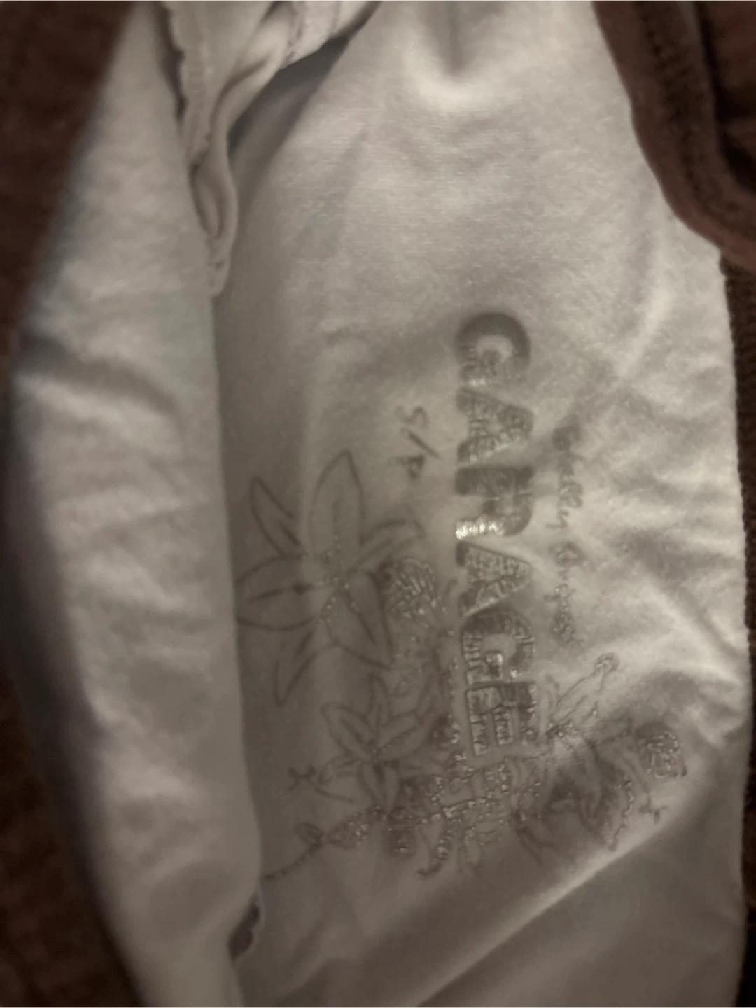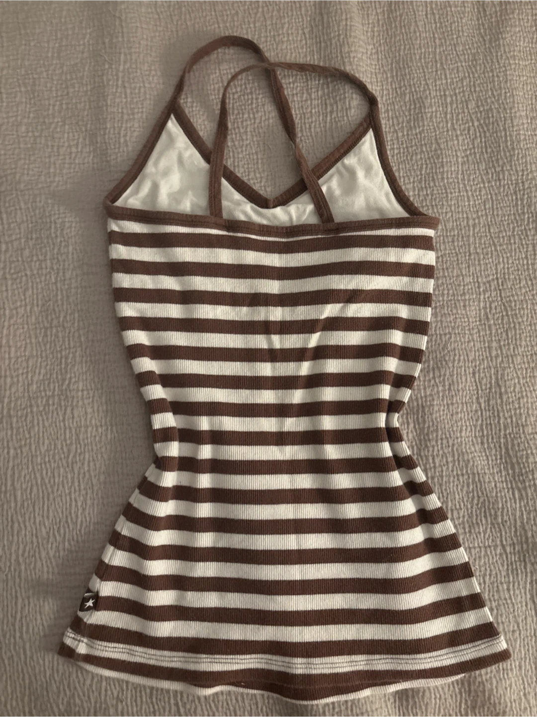 This is a brown and white striped halter tank top from Garage. It's a size small with a ribbed knit material. Adds a cute flair to any outfit!