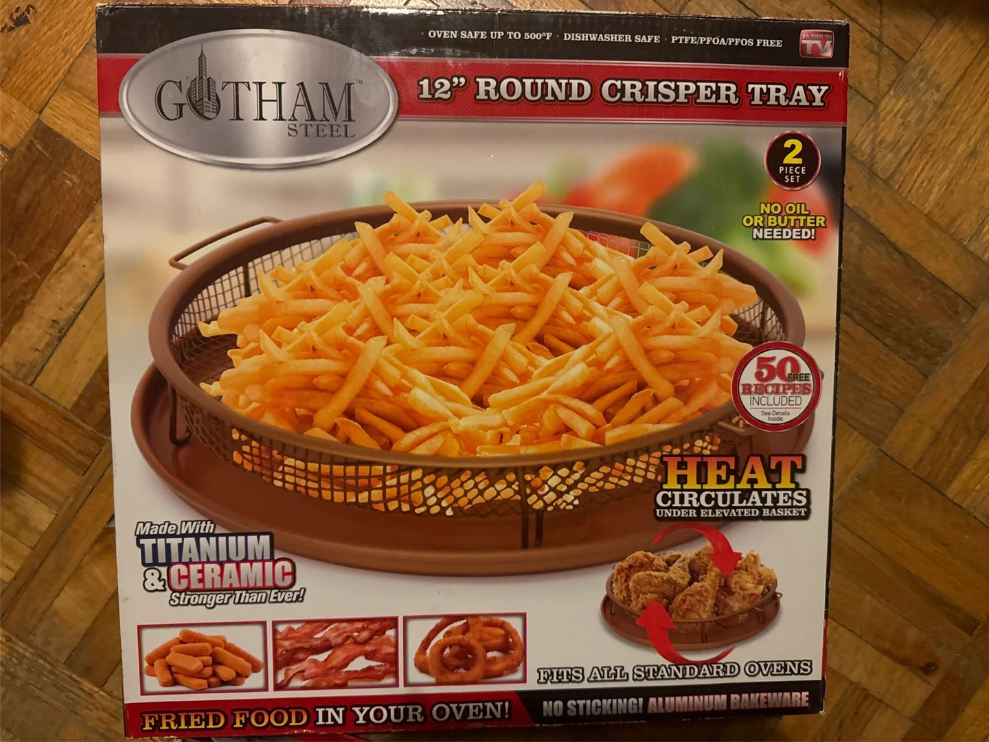 Selling a brand new Gotham Steel 12" Round Crisper Tray! It's a 2-piece set, perfect for making crispy fried food in your oven without oil or butter. The basket size is 12" x 9" / 30.4cm x 22.8cm, and the tray size is 12.6" x 9.4" / 32cm x 24cm. It's made with titanium and ceramic, making it stronger than ever! Oven safe up to 500°F and dishwasher safe