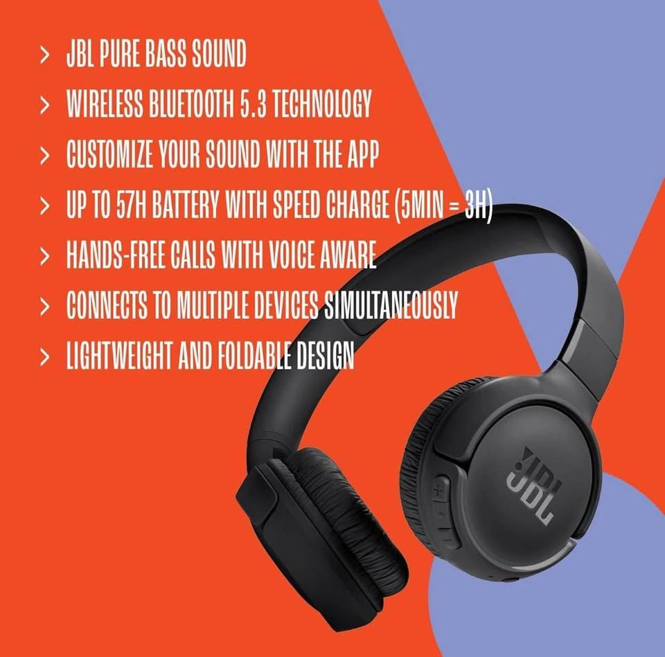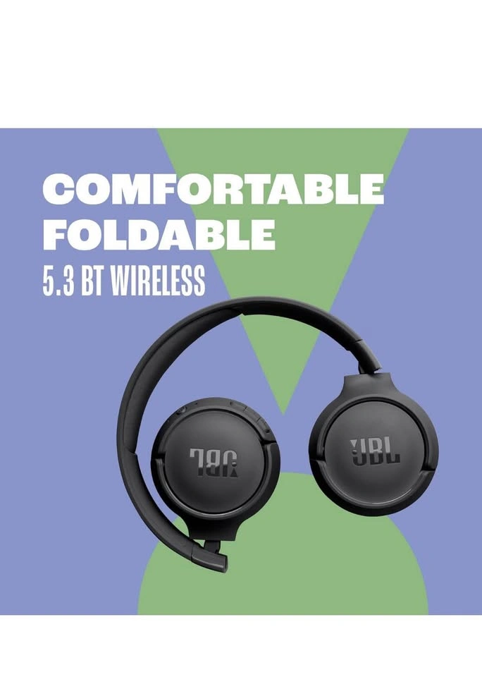 Enjoy JBL Pure Bass Sound, the same technology found in famous venues worldwide. These headphones feature Bluetooth 5.3 for high-quality wireless streaming from your smartphone. Customize your sound with the JBL Headphones App's EQ. Listen wirelessly for up to 57 hours on a full charge, or get 3 hours of playback with just a 5-minute charge using the Type-C USB cable. The quick 2-hour recharge gets you back to listening. Manage your sound and calls easily with on-earcup buttons, and use Voice Aware to hear yourself while talking. Lightweight, comfortable, and foldable design.
