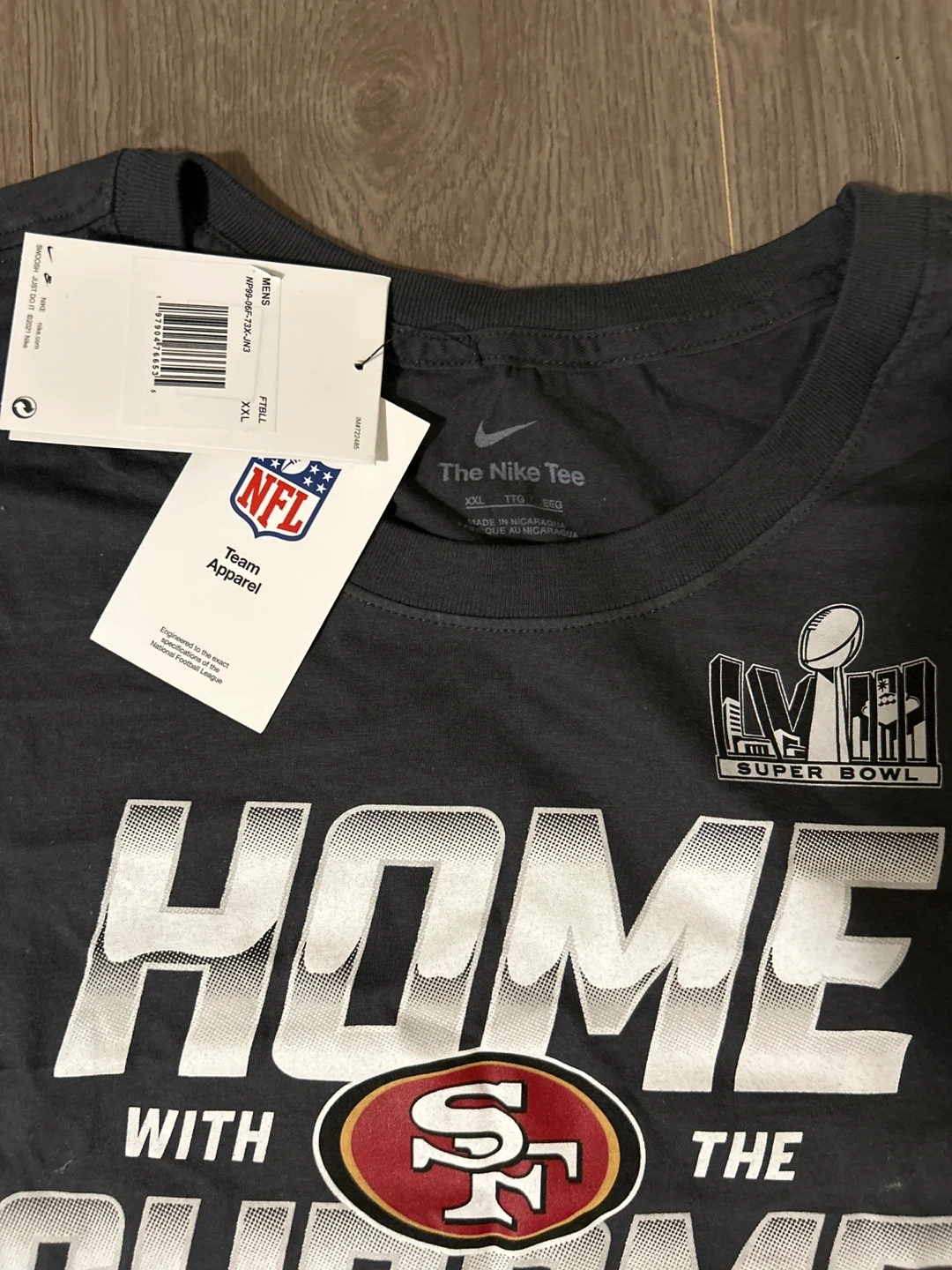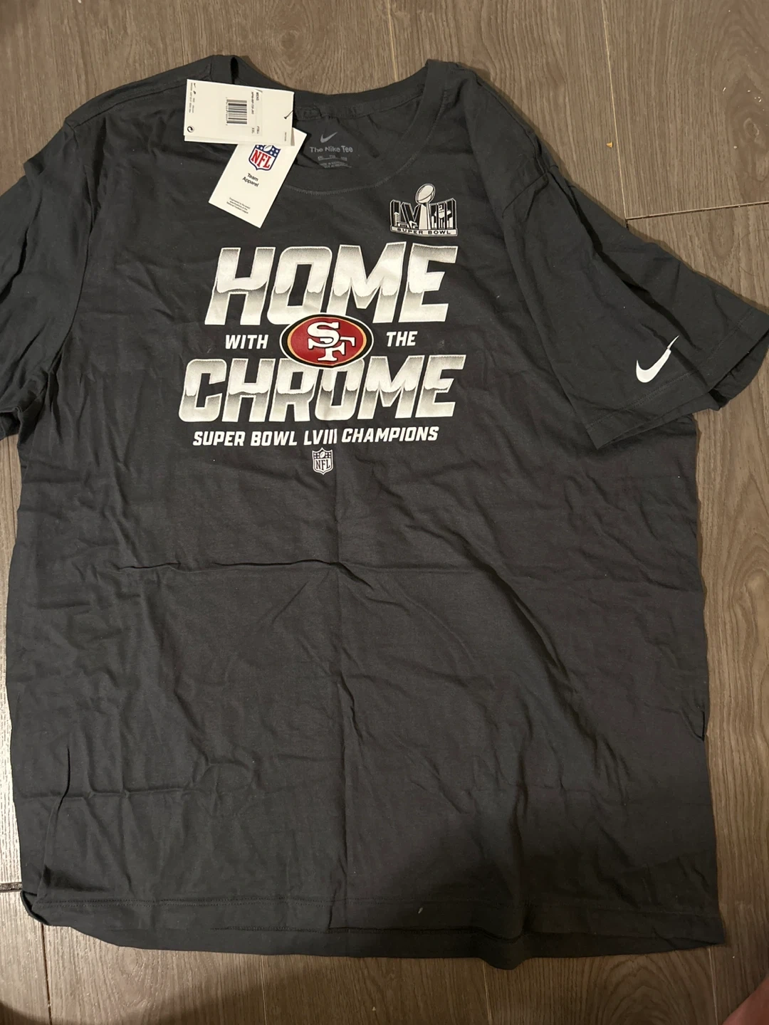 Selling a Nike t-shirt celebrating the San Francisco 49ers as Super Bowl LVIII Champions. It's a men's size XXL. The shirt is black and features the text 'Home With The Chrome'.