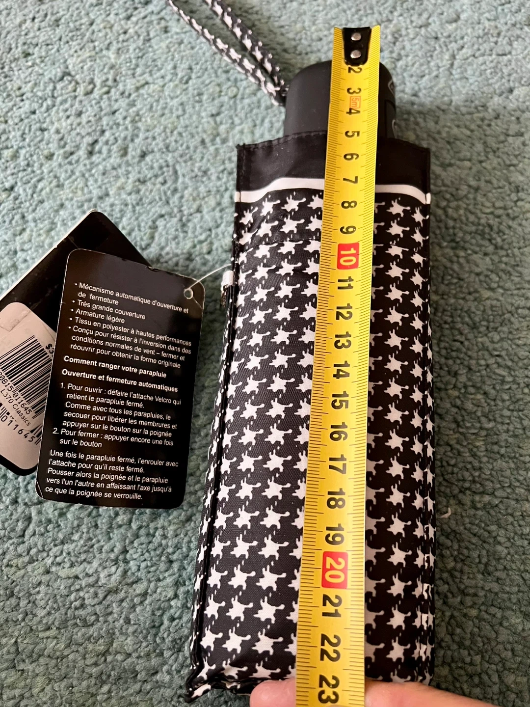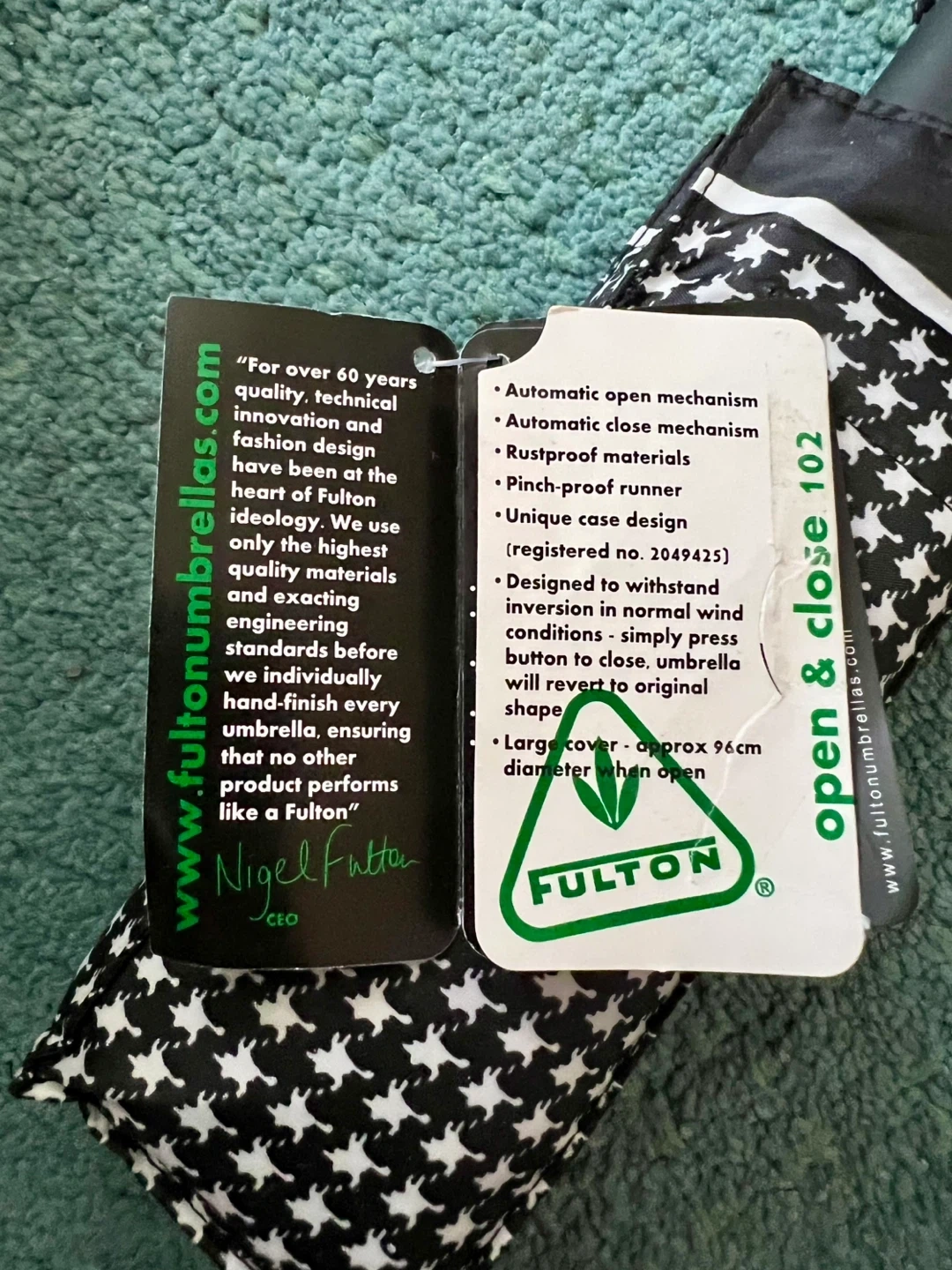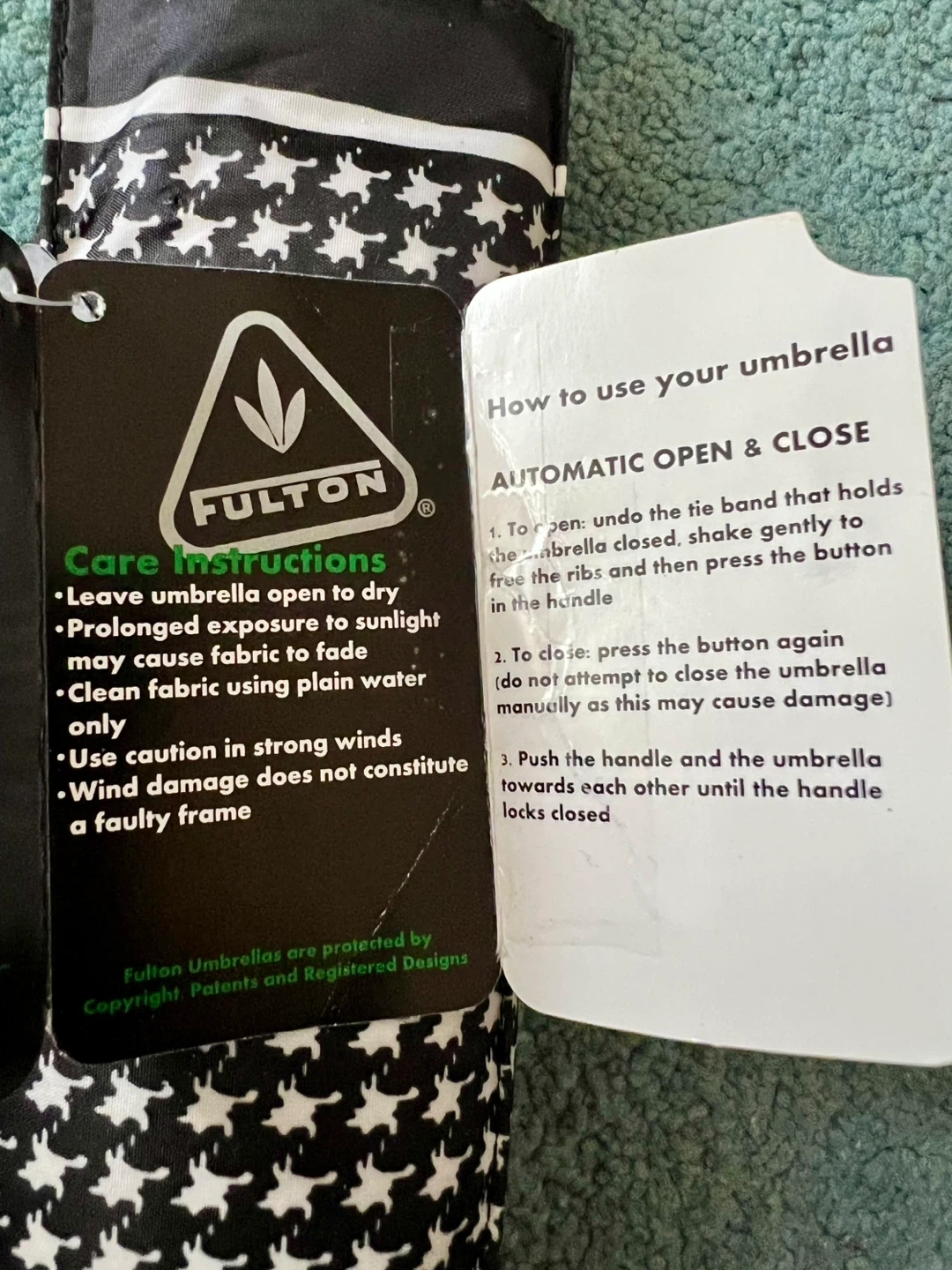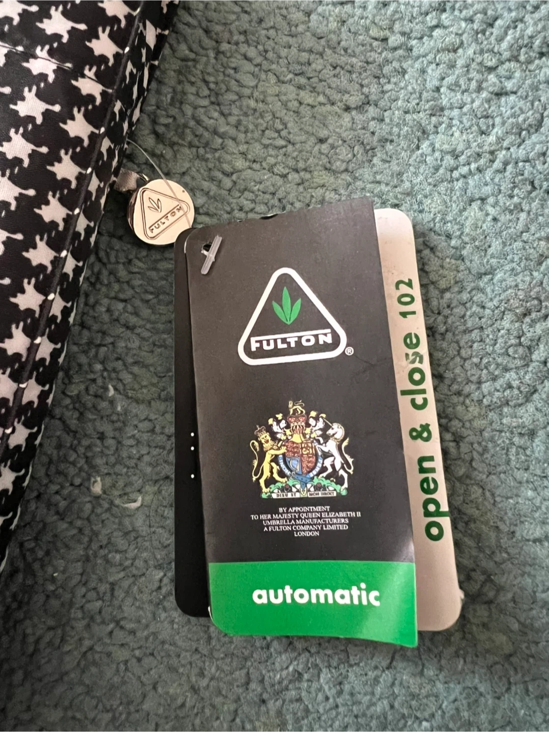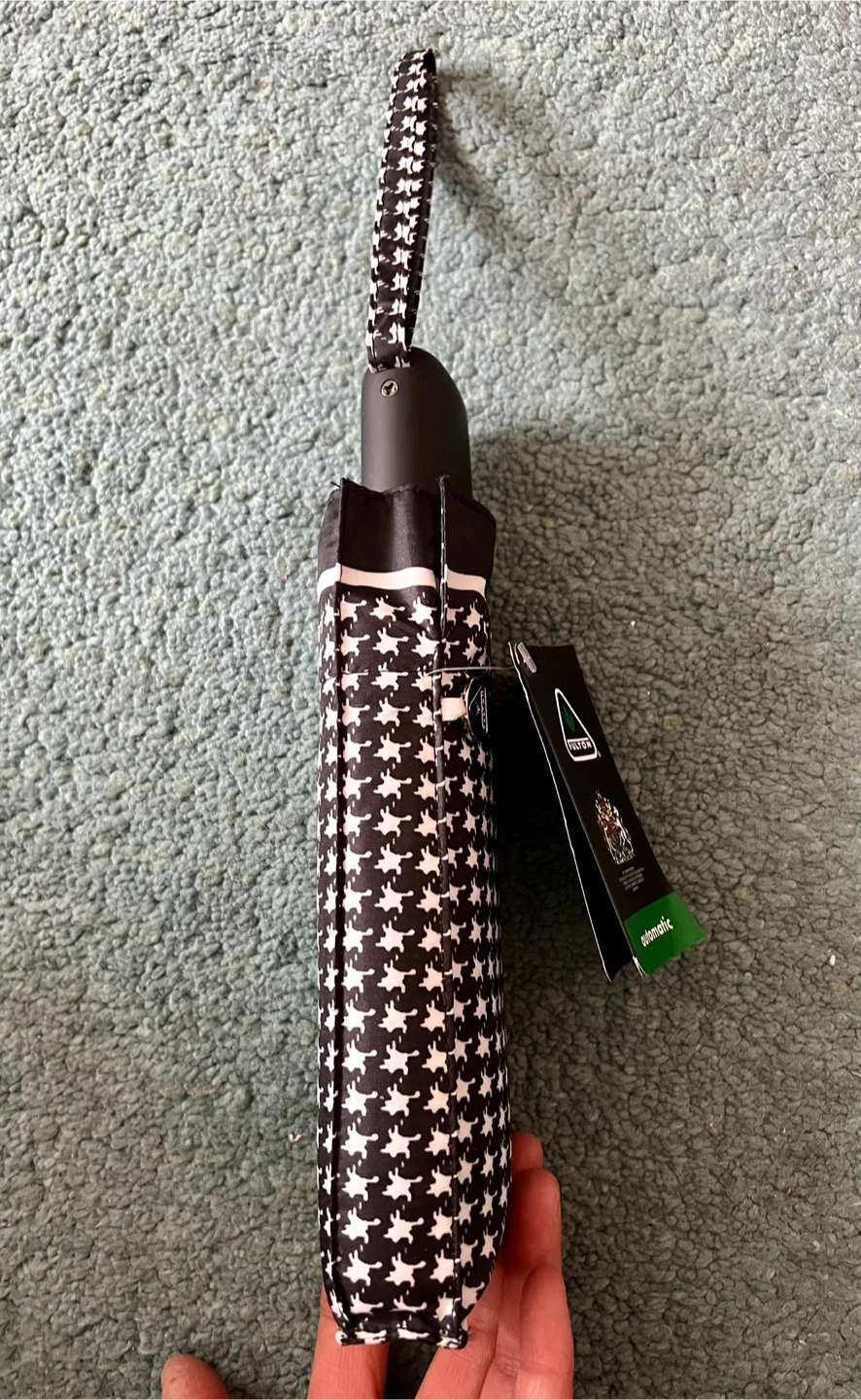 This is a brand new Fulton automatic umbrella with a black houndstooth pattern. It features rustproof materials and a pinch-proof runner.