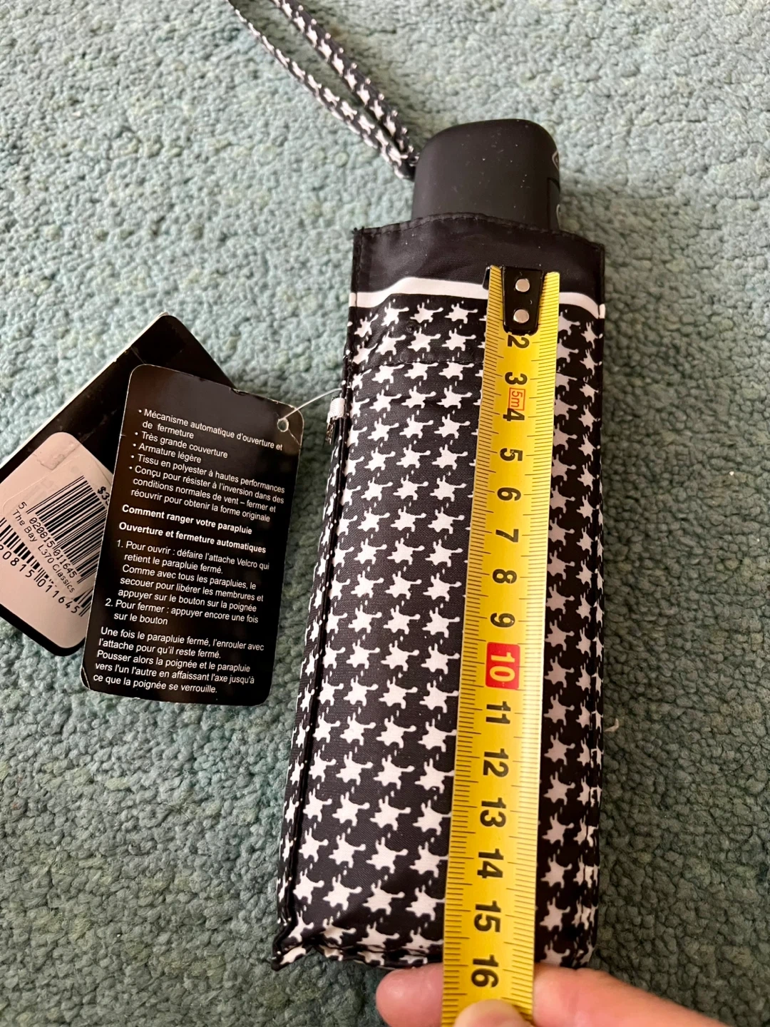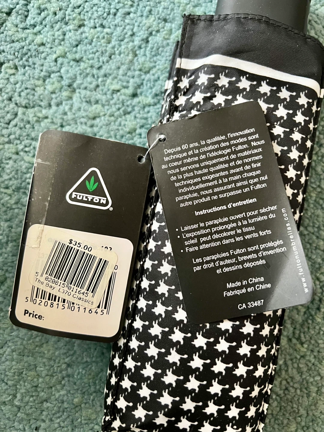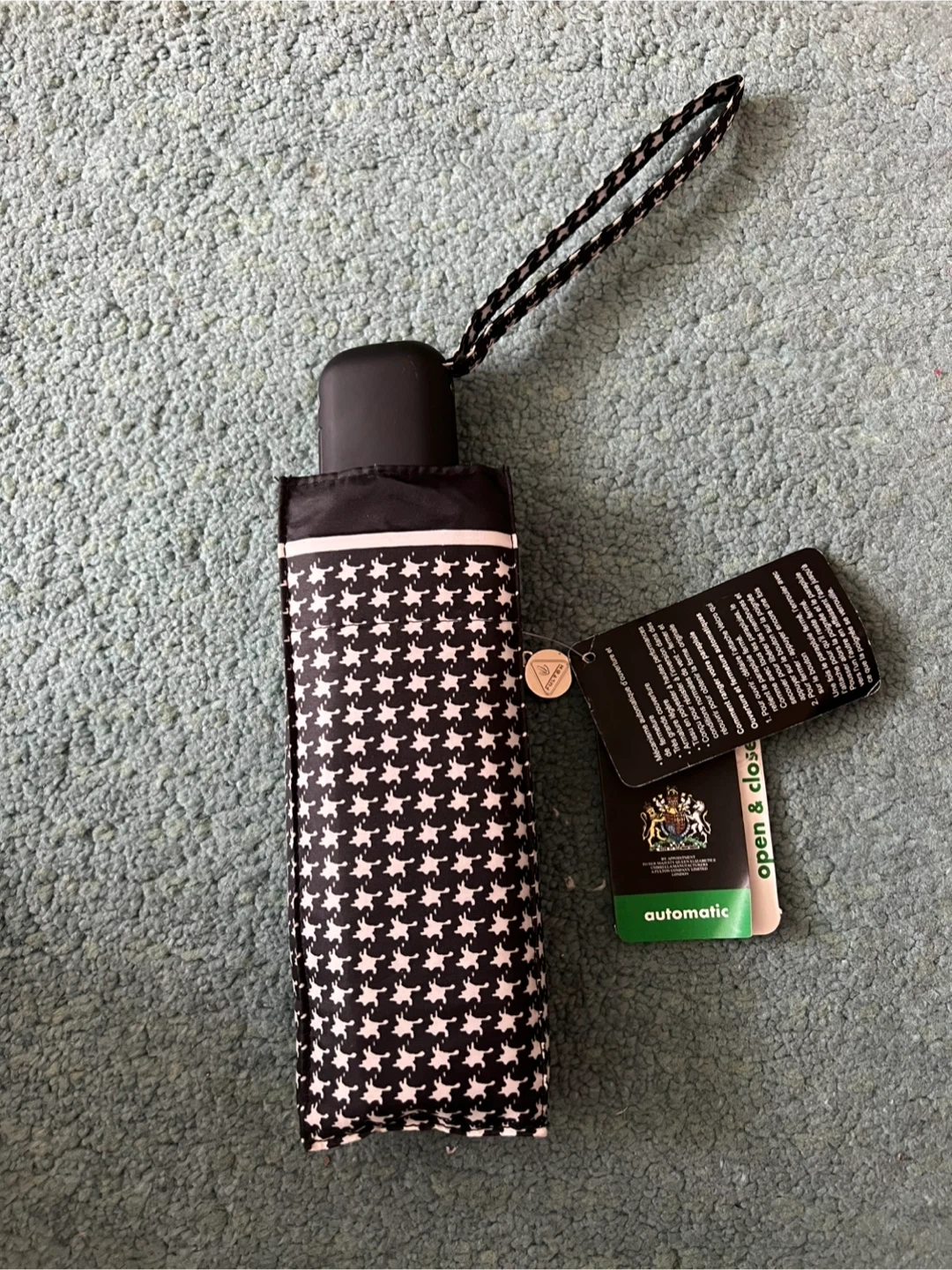 This is a brand new Fulton automatic umbrella with a black houndstooth pattern. It features rustproof materials and a pinch-proof runner.