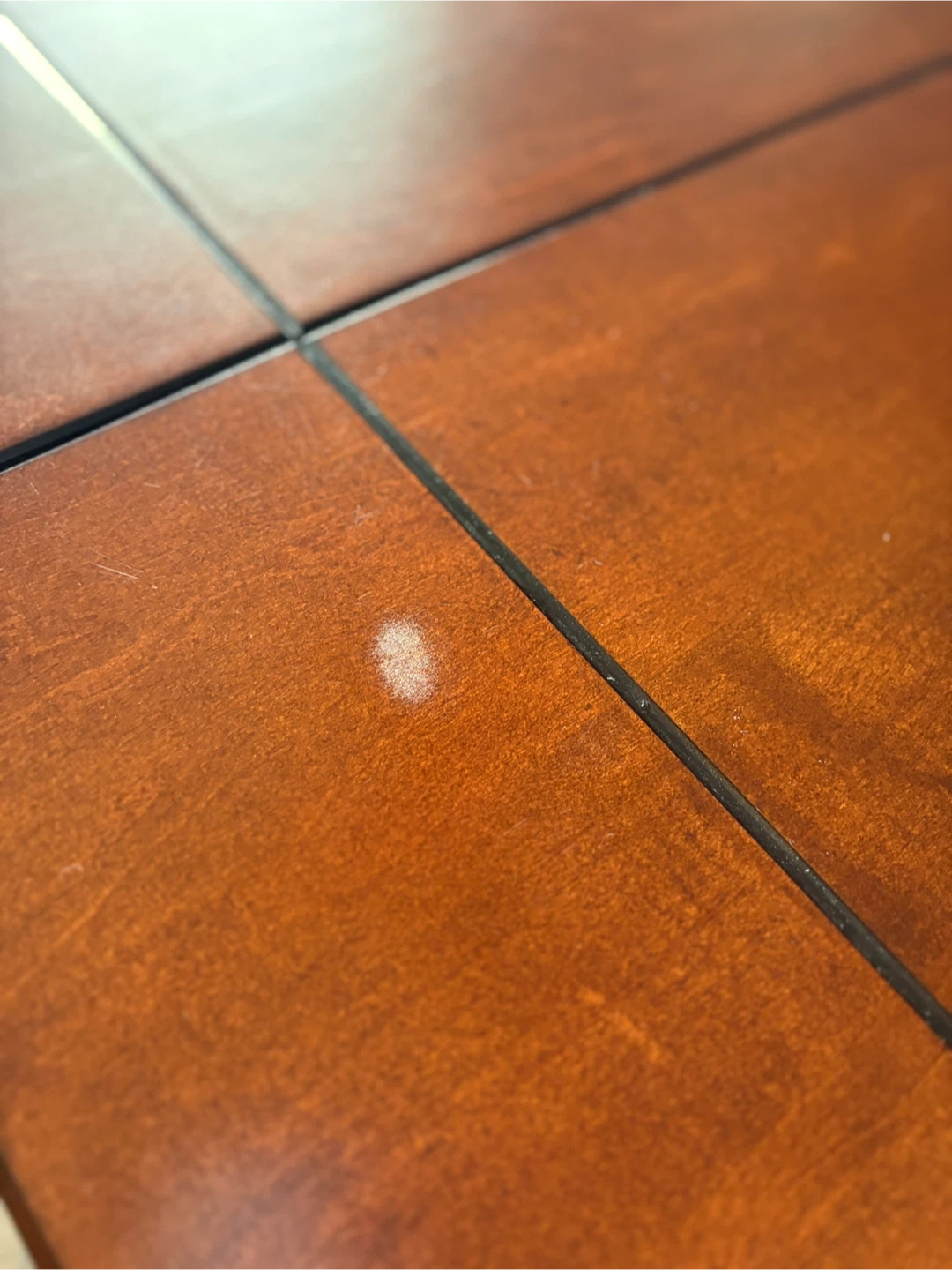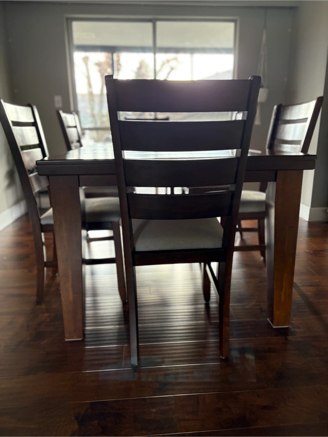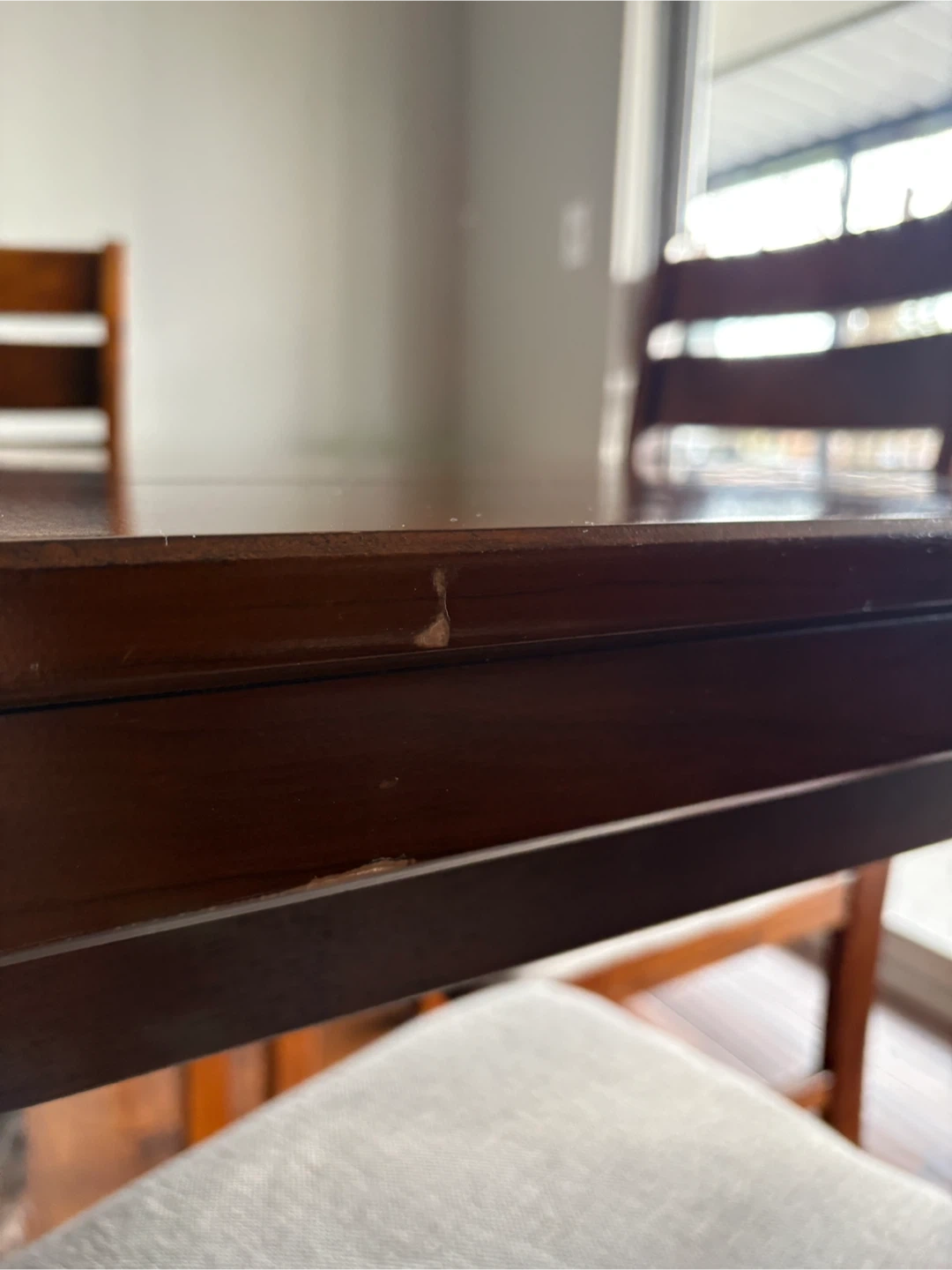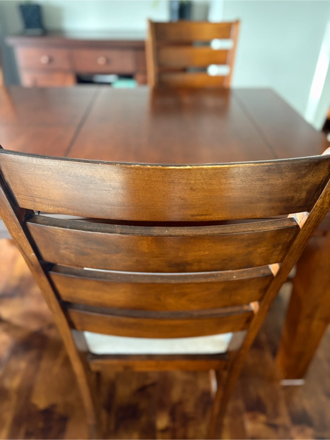 Solid wood dining table with a warm cherry finish. It includes 6 upholstered chairs with light beige fabric seats. Tabletop shows minor wear like a water spot and some surface scratches, consistent with regular use.