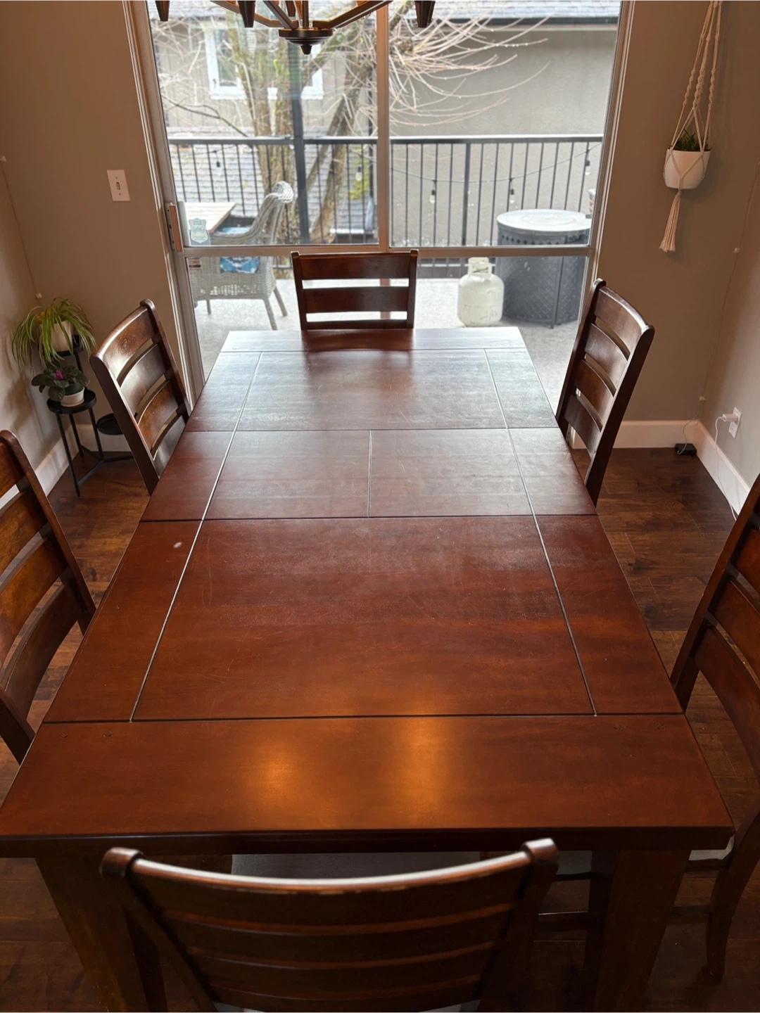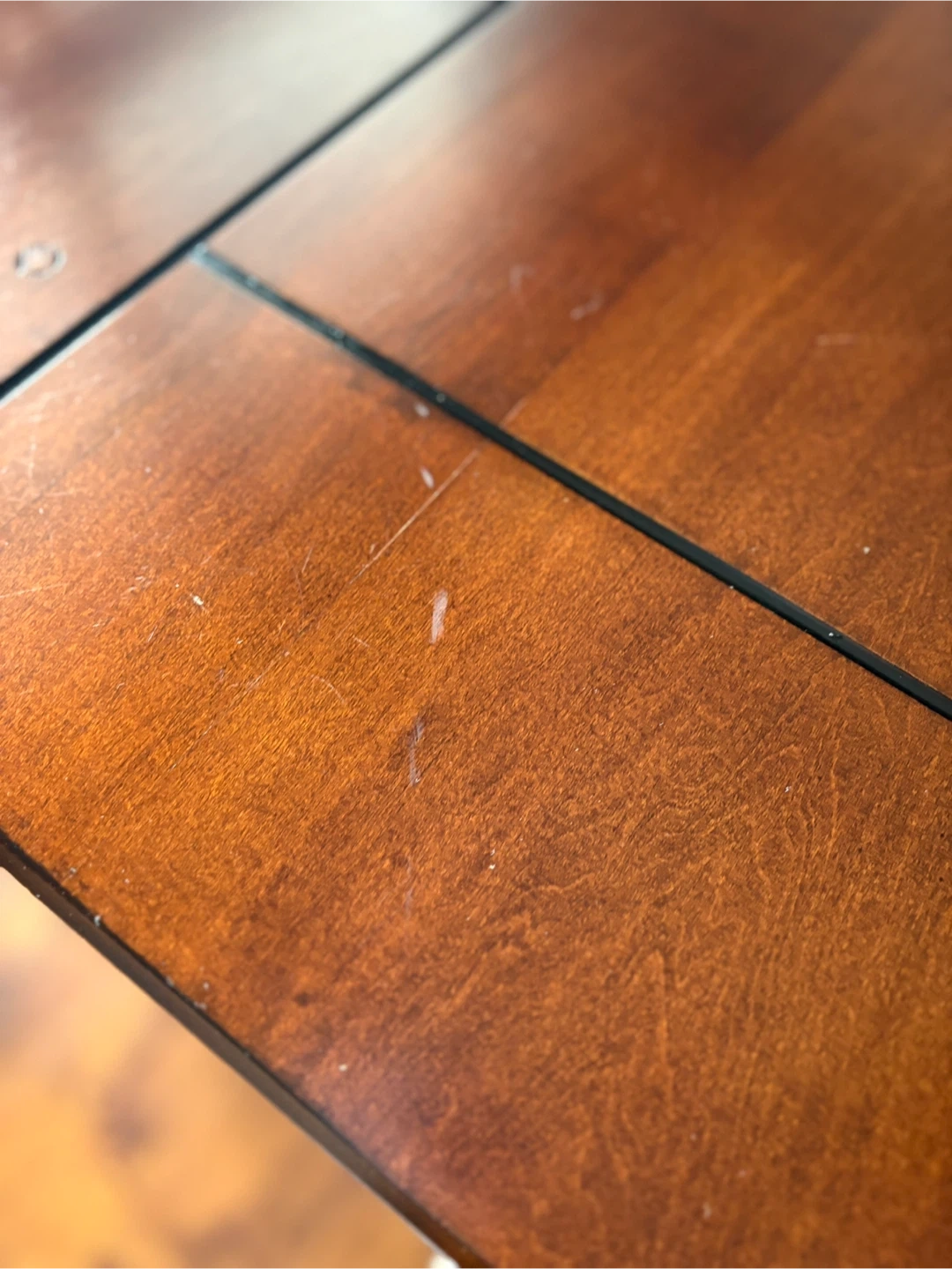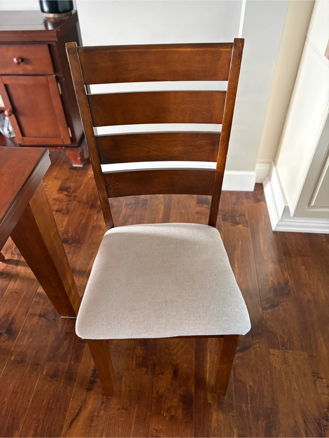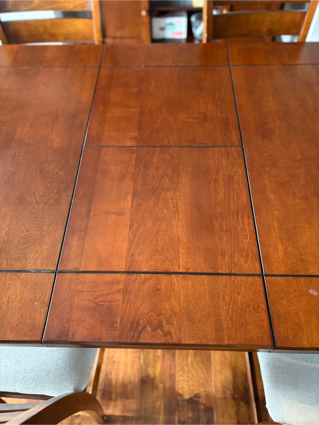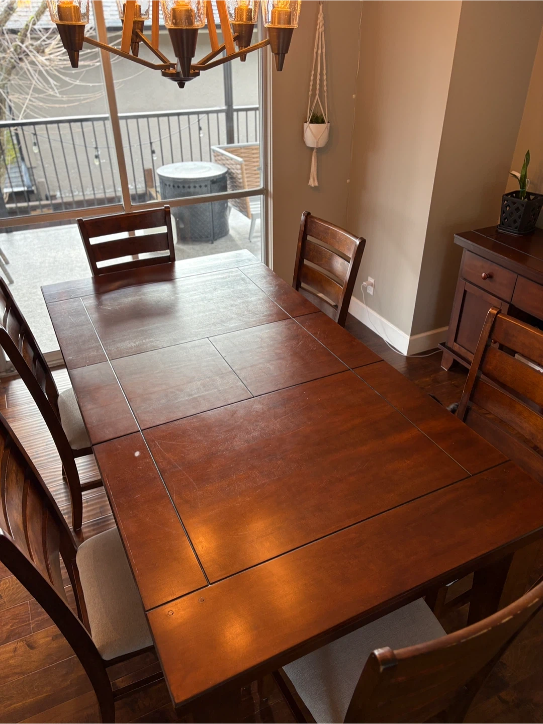Solid wood dining table with a warm cherry finish. It includes 6 upholstered chairs with light beige fabric seats. Tabletop shows minor wear like a water spot and some surface scratches, consistent with regular use.