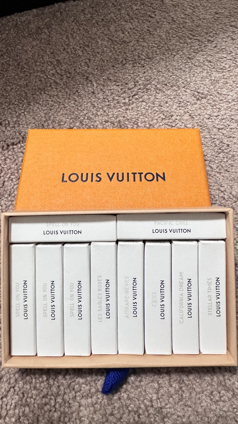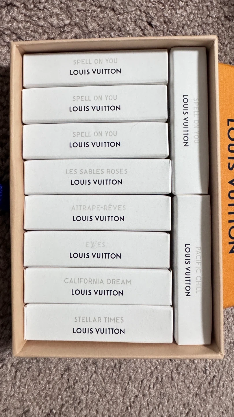 A collection of Louis Vuitton miniature perfumes including Spell On You, Les Sables Roses, Attrape-Rêves, Eyes, California Dream, Stellar Times, and Pacific Chill. It's a great way to sample their fragrances!