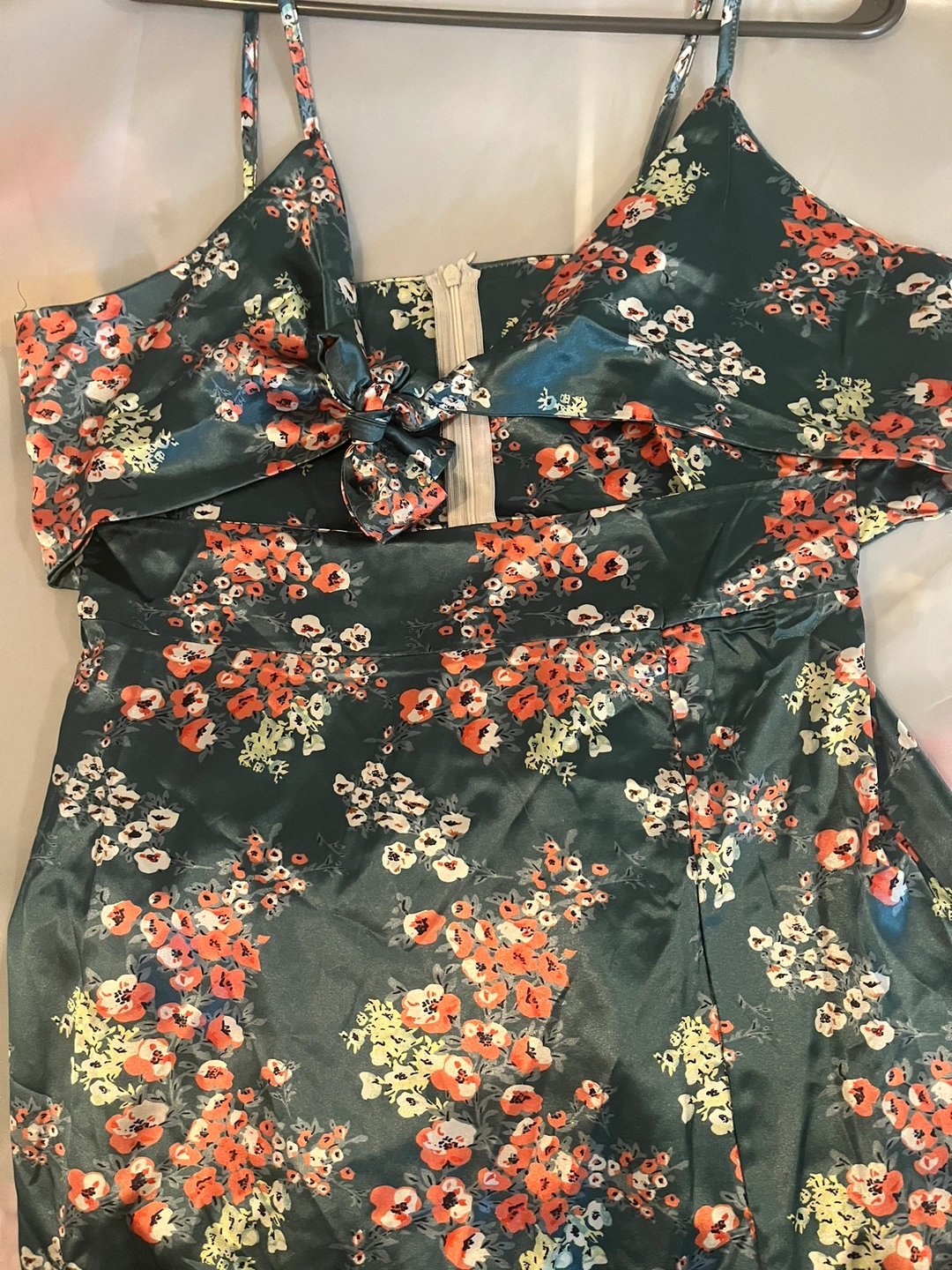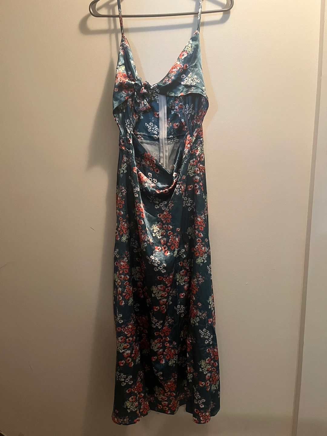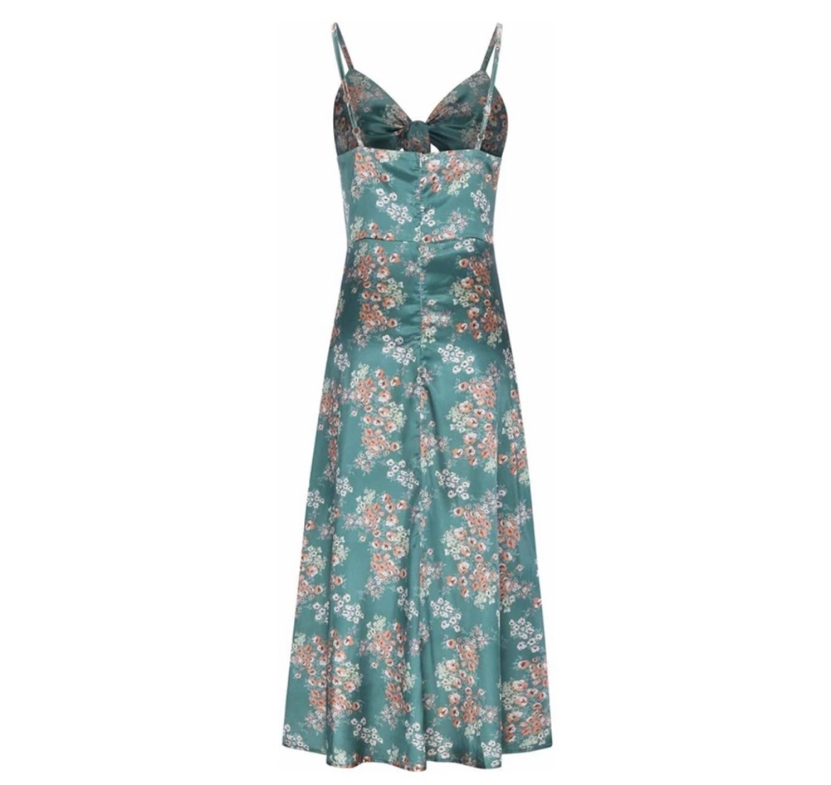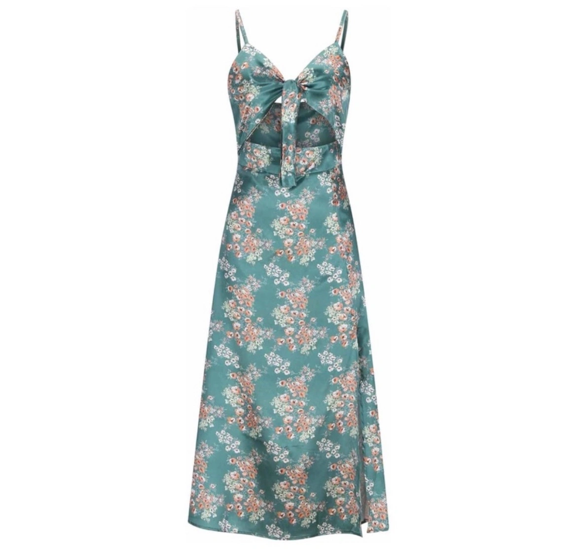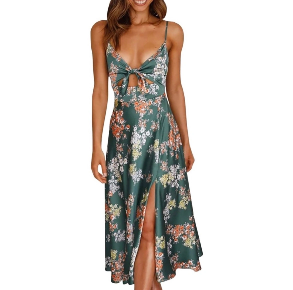 Women Boho Sexy Cami Satin Dress Floral Prints Tie Front V-neck Sleeveless Straps Backless Flowy Midi Dress with Slit