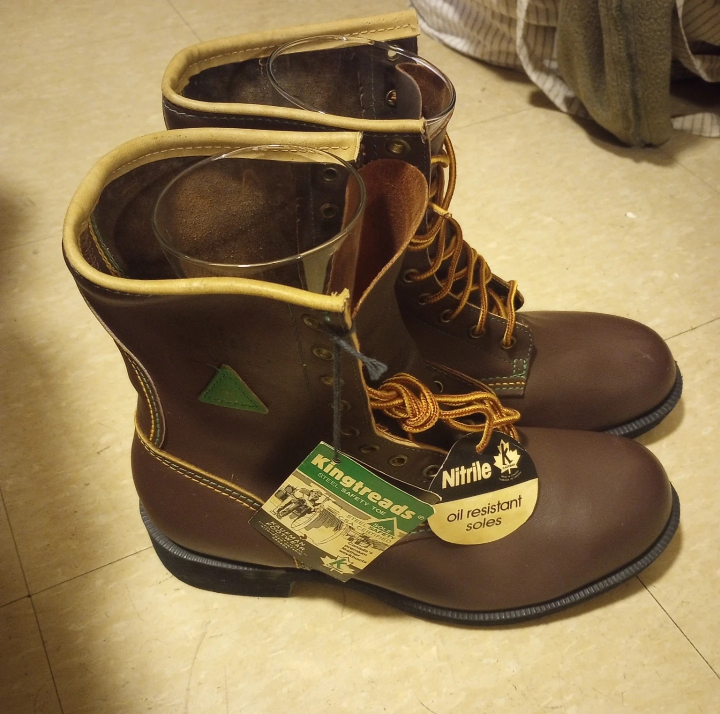 Selling a pair of brand new Kingtreads steel toe work boots in brown. They feature oil resistant soles. Great for work or outdoor activities!