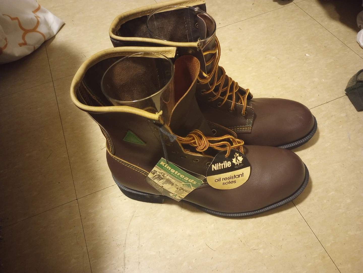 Selling a pair of brand new Kingtreads steel toe work boots in brown. They feature oil resistant soles. Great for work or outdoor activities!
