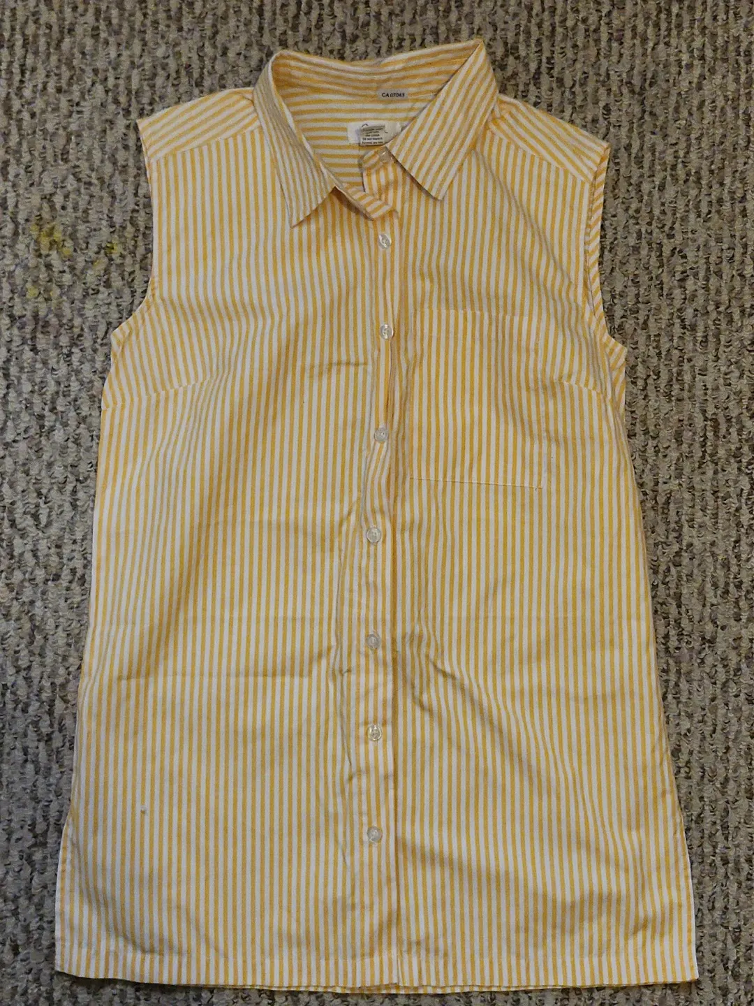 This is a sleeveless button-up blouse with a yellow and white stripe pattern. It features a collar and a single chest pocket. Cotton blend material.