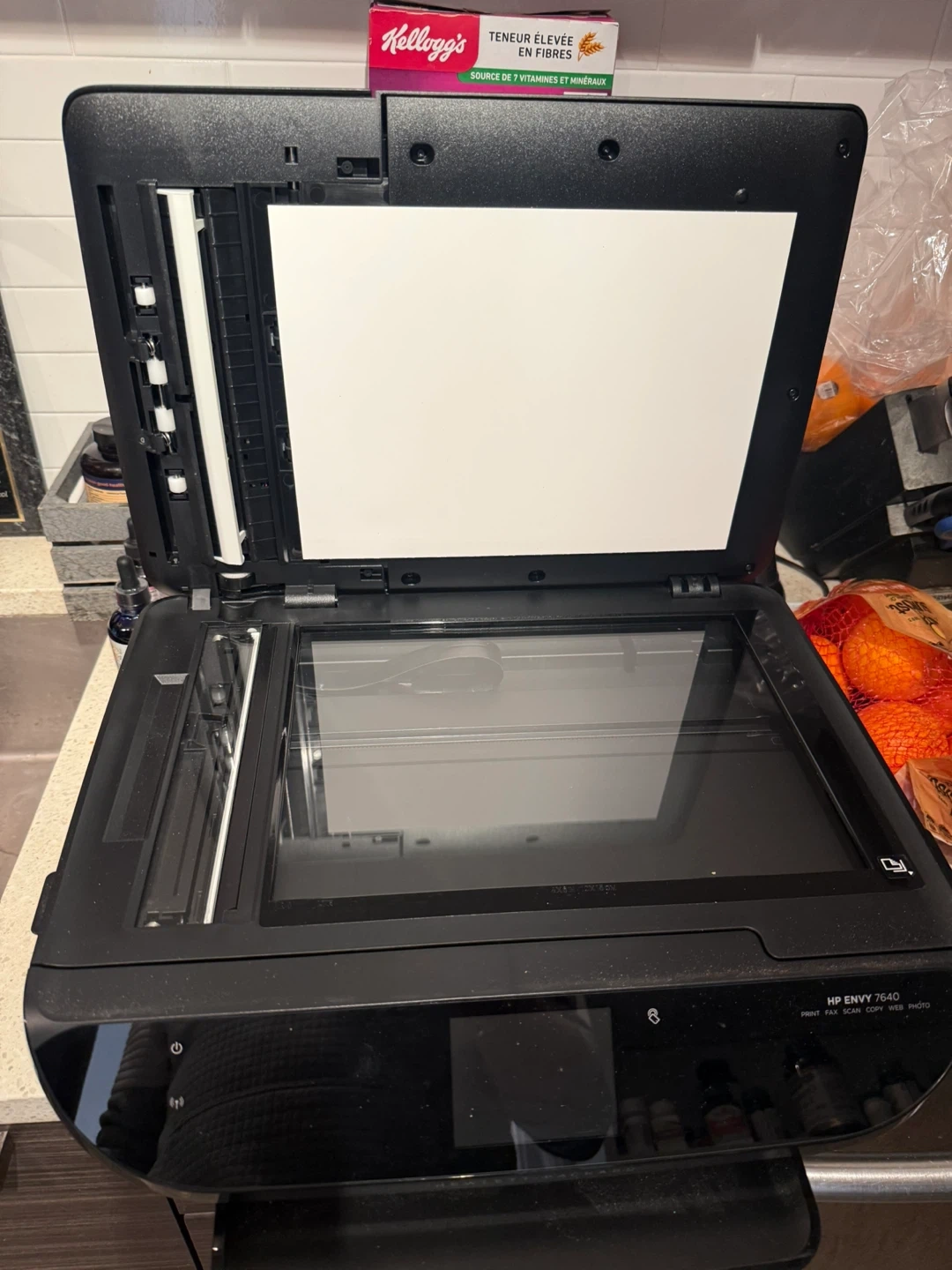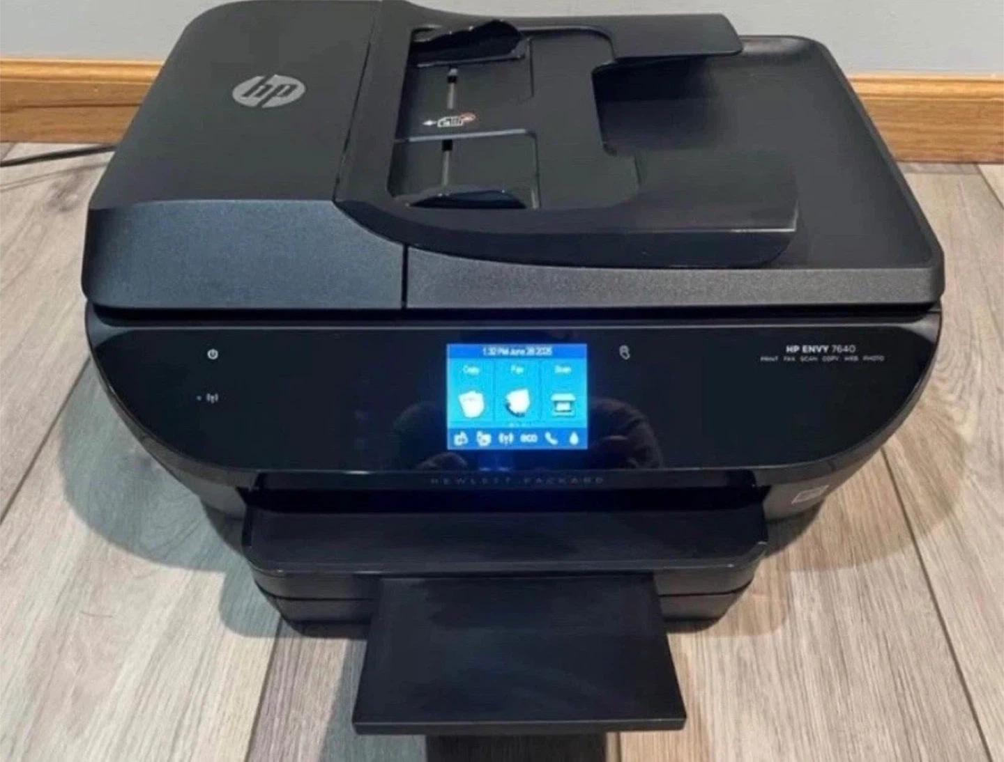 HP ENVY 7640 all-in-one printer with print, fax, scan, copy, and web functions. It's a versatile inkjet printer. This printer is suitable for home offices or small businesses needing multifunction capabilities.