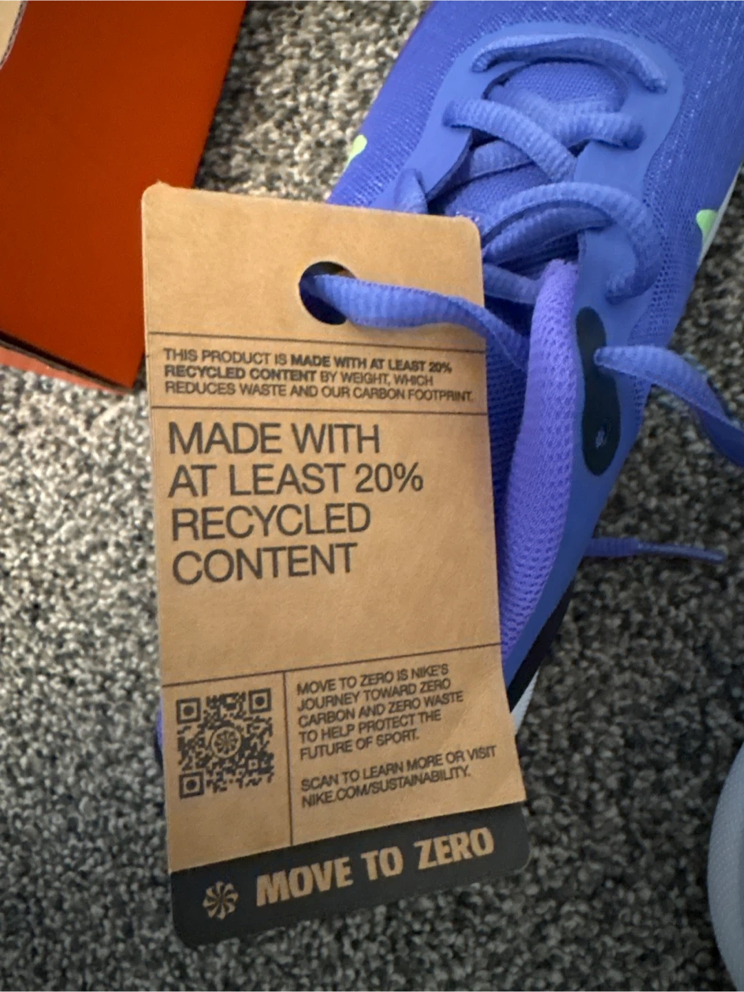 These Nike Revolution 7 (GS) shoes are blue with a lime green swoosh and black accents. They're made with at least 20% recycled content. The box indicates size 4.5Y, UK 4, EUR 36.5. New in box
