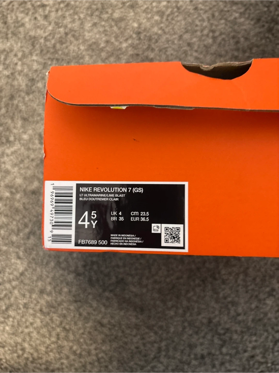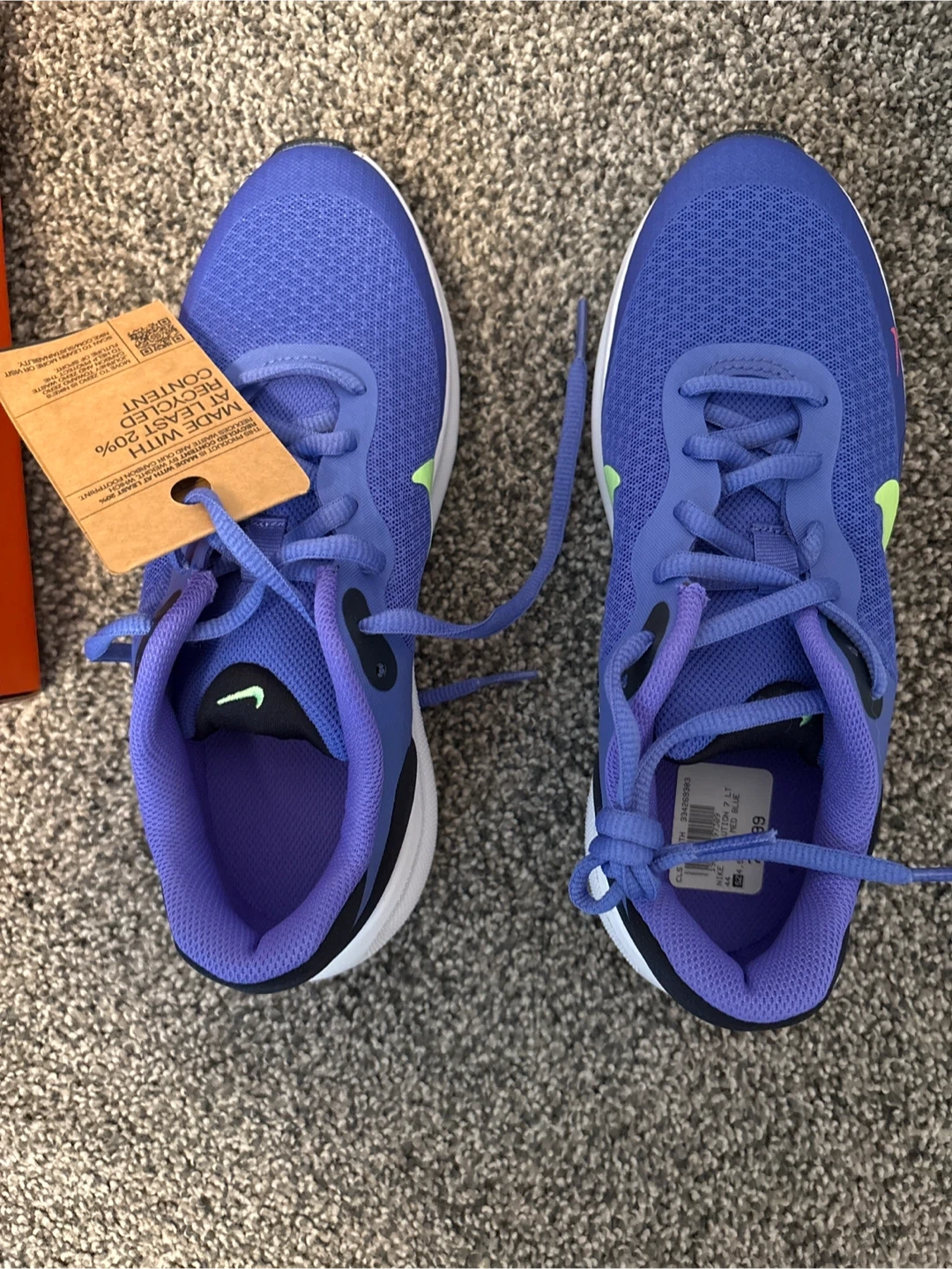 These Nike Revolution 7 (GS) shoes are blue with a lime green swoosh and black accents. They're made with at least 20% recycled content. The box indicates size 4.5Y, UK 4, EUR 36.5. New in box