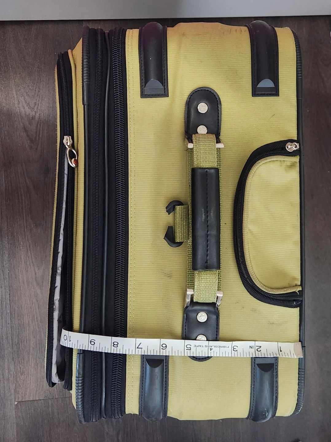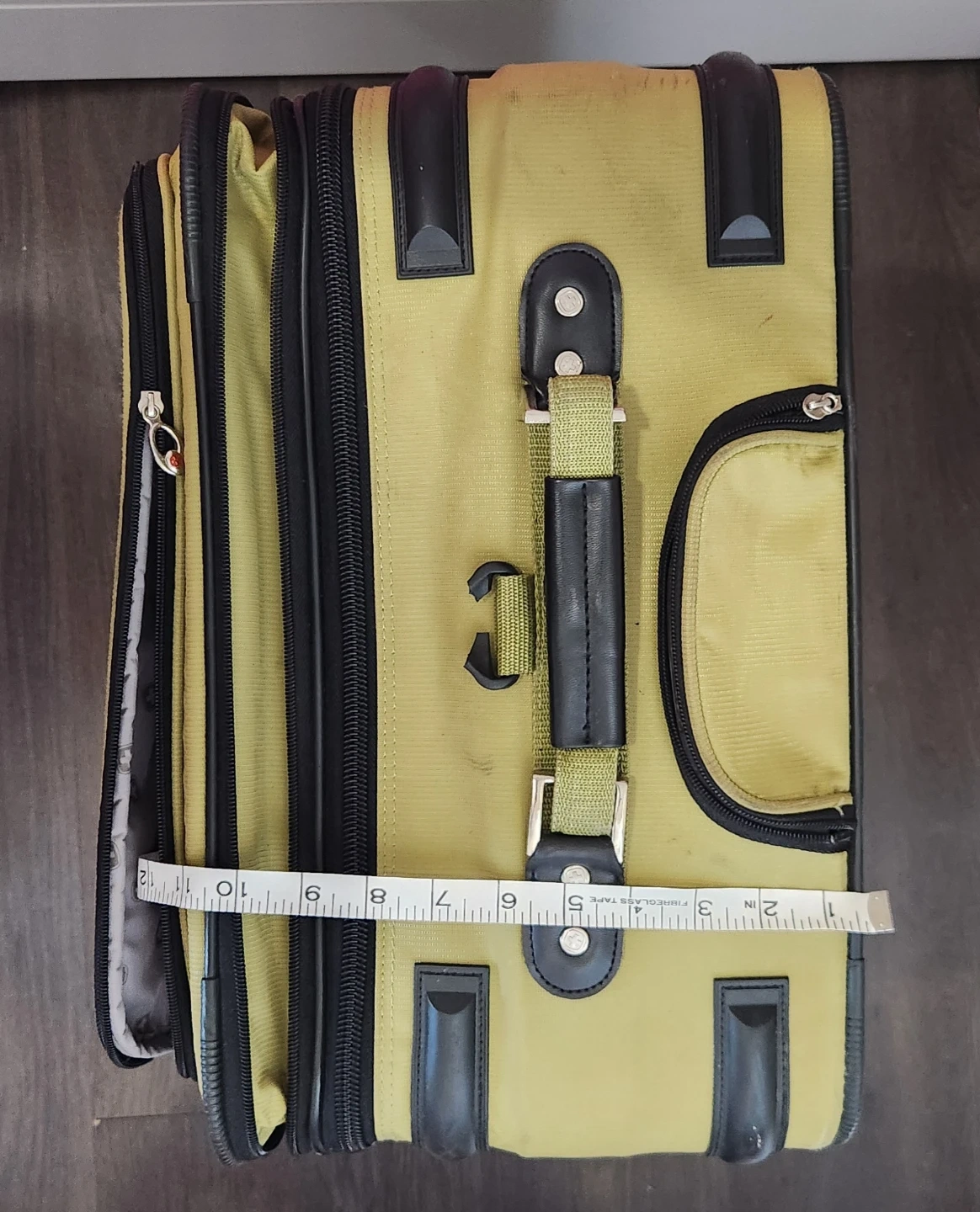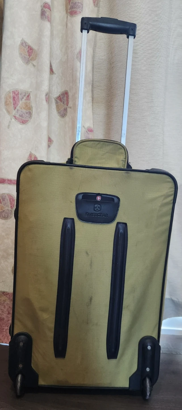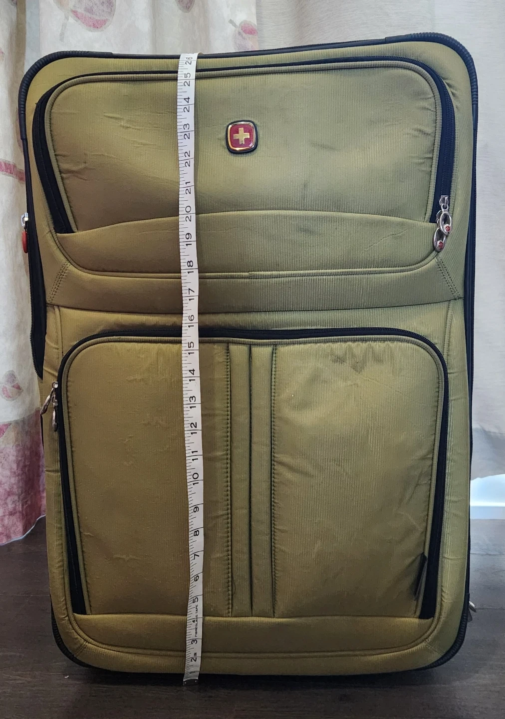 This is a Swiss Gear rolling suitcase in a olive green colour. It has a retractable handle and two wheels for easy transport. Multiple pockets for organization. There's damage in the inside of the case in the last picture.