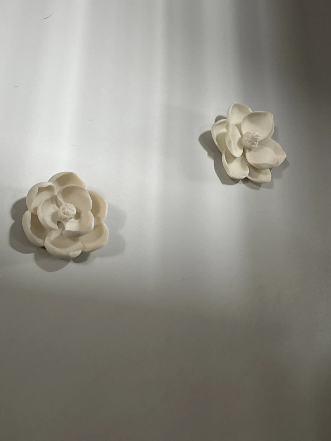 Two decorative cream-coloured magnolia flowers. These are wall decor pieces. Each flower measures approximately 5 inches in diameter.