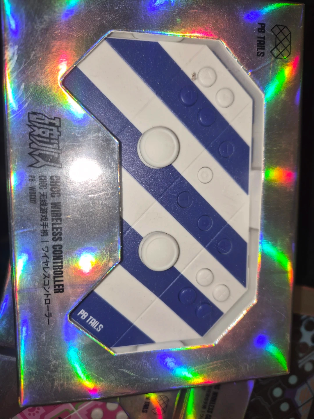 PB TAILS CHOC wireless controller. Available in blue and white striped, pink geometric, and black and purple cyber designs. Connects wirelessly for gaming. Controller includes two joysticks, directional buttons, and action buttons.