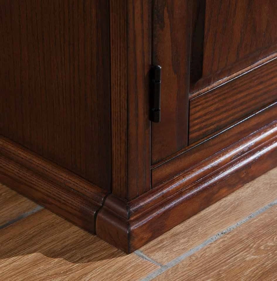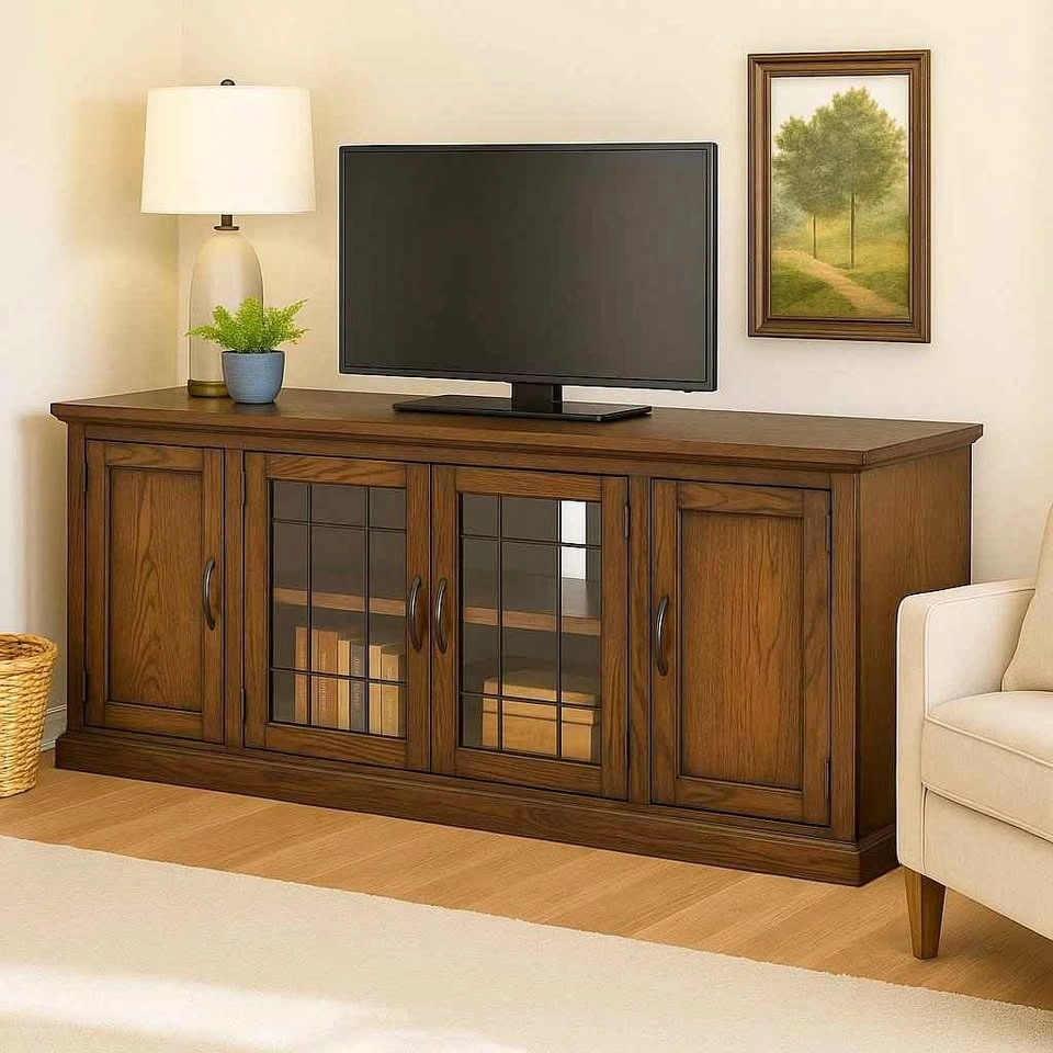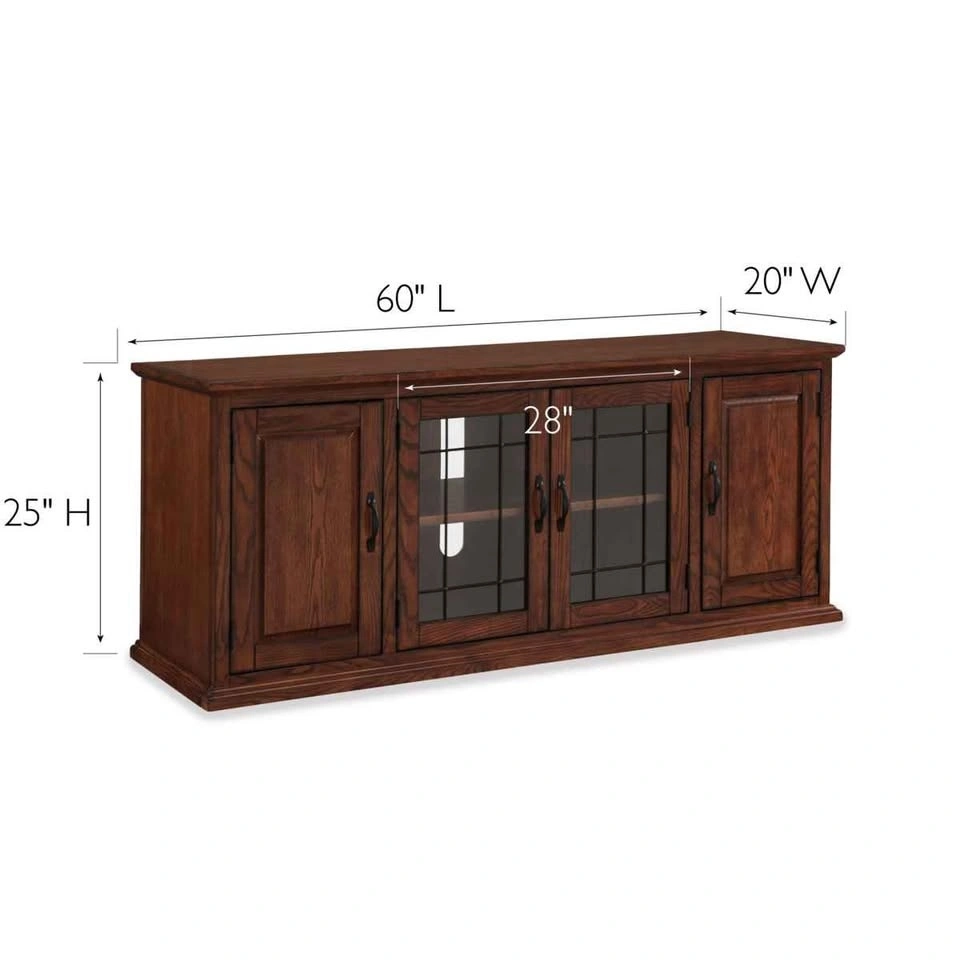 This Leick Home leaded glass TV stand accommodates televisions 60 inches or smaller and tames CD/DVD players and gaming devices in a neat and tidy display of efficiency. Adjustable shelves behind the glass will accommodate a variety of electronic setups and keep them dust-free. Crafted from solid wood and wood veneers, the burnished oak finish highlights the beauty of the wooden legs and will become a sturdy centerpiece in any room. It assembles easily in minutes thanks to its clever hinged construction.