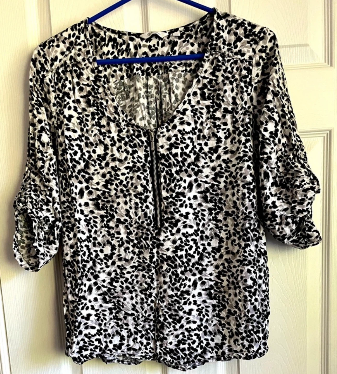 Here's a stylish animal print blouse from Reitmans! It features a zip-up front and 3/4 sleeves, perfect for a casual yet chic look
