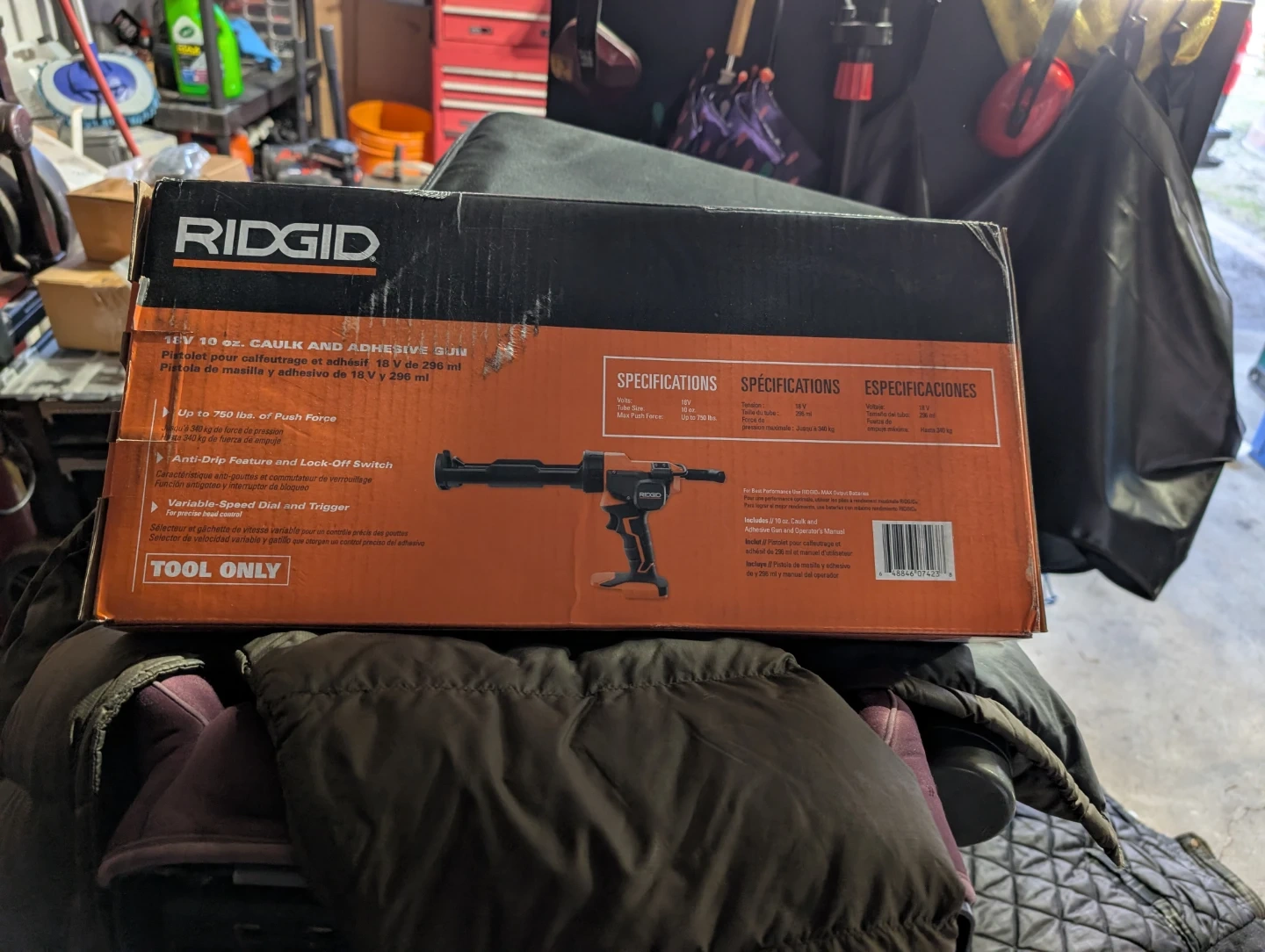 This is a RIDGID 18V cordless caulk and adhesive gun. It has up to 750 lbs. of push force, an anti-drip feature, and a variable-speed dial and trigger. This is a tool-only listing, so batteries and charger are not included. It includes the 10 oz. caulk and adhesive gun and operator's manual.
