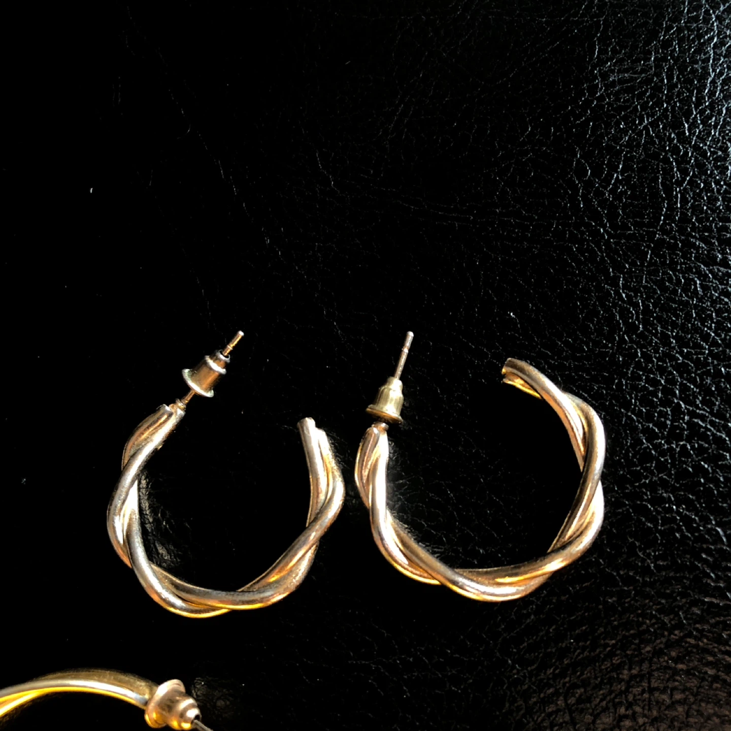 Set of two pairs of gold-tone hoop earrings. One pair features a twisted design, and the other has a smooth finish. Post back closures.