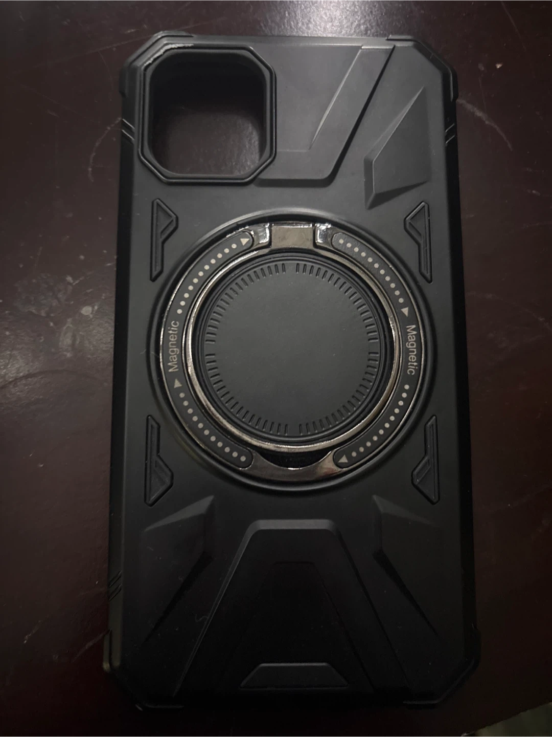 This is a black phone case with a built-in magnetic ring. It offers a rugged design for protection. The ring doubles as a stand or finger grip.
