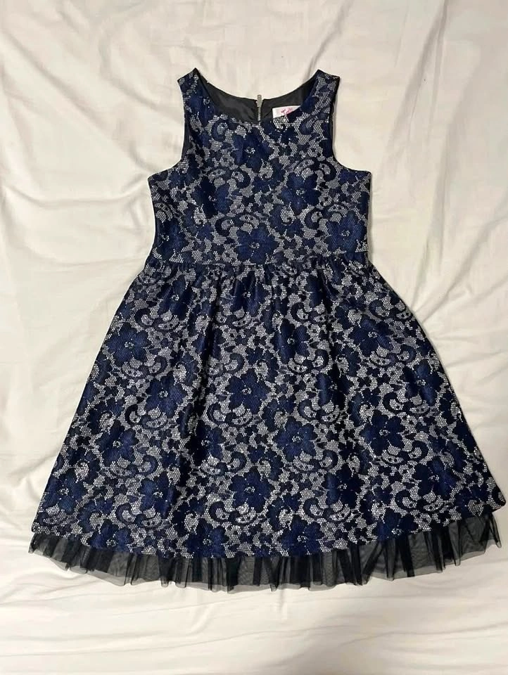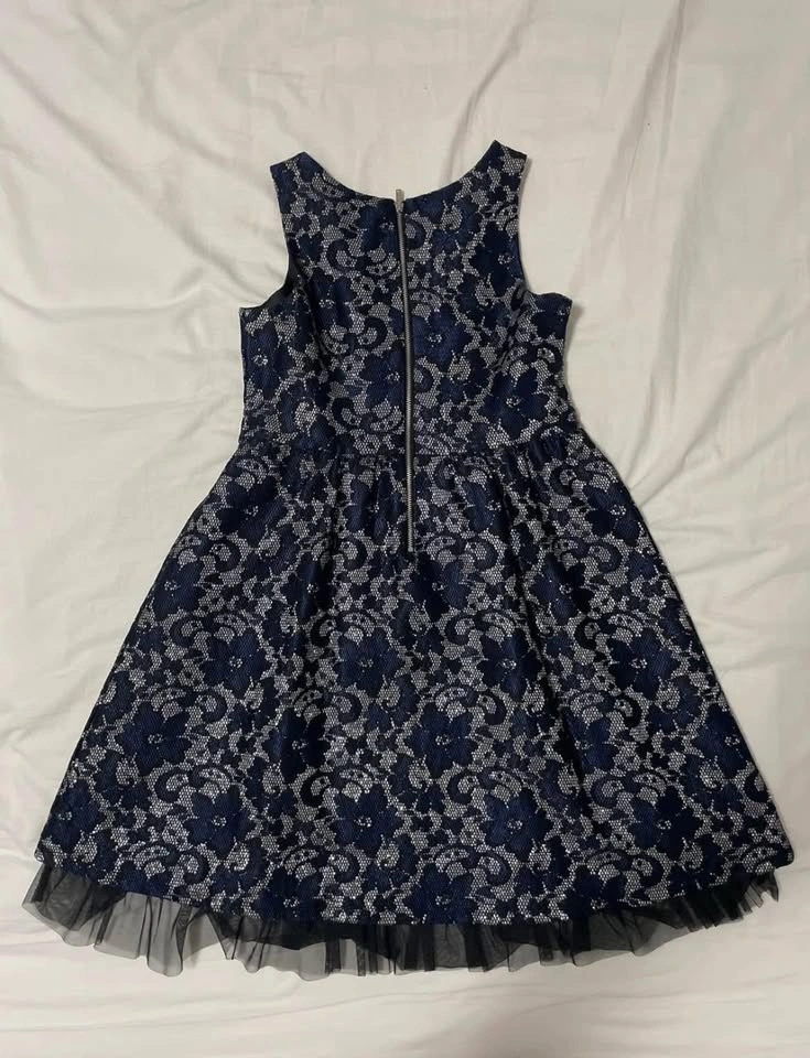 Navy blue dress with a sparkly silver pattern. A-line fit with tulle ruffles on the bottom edge. Zipper closure at the back.