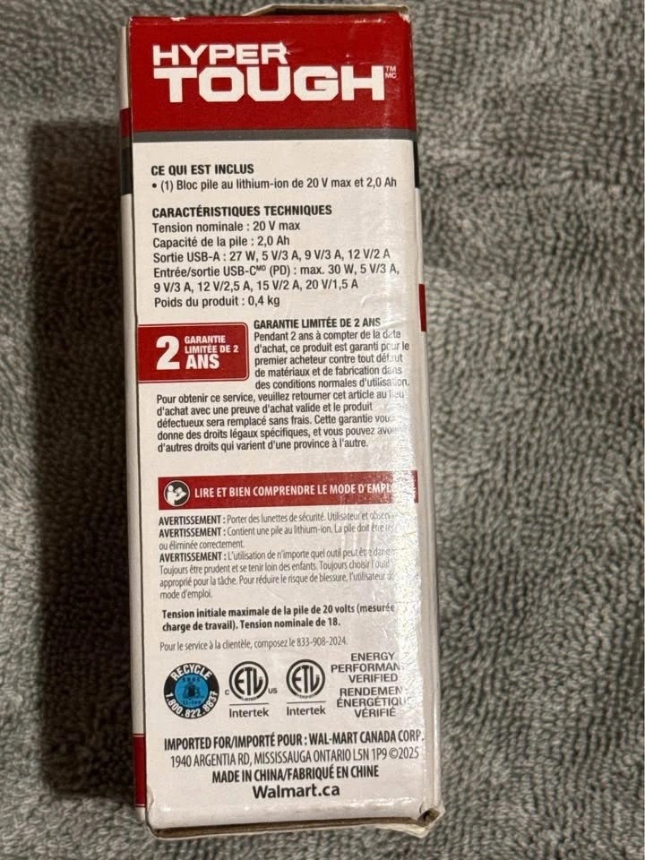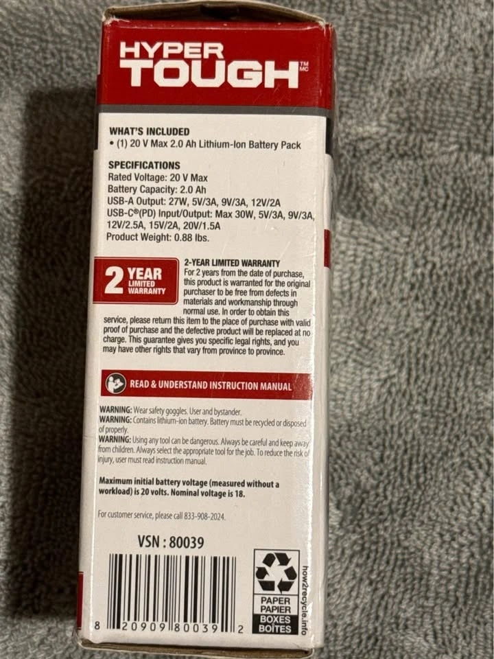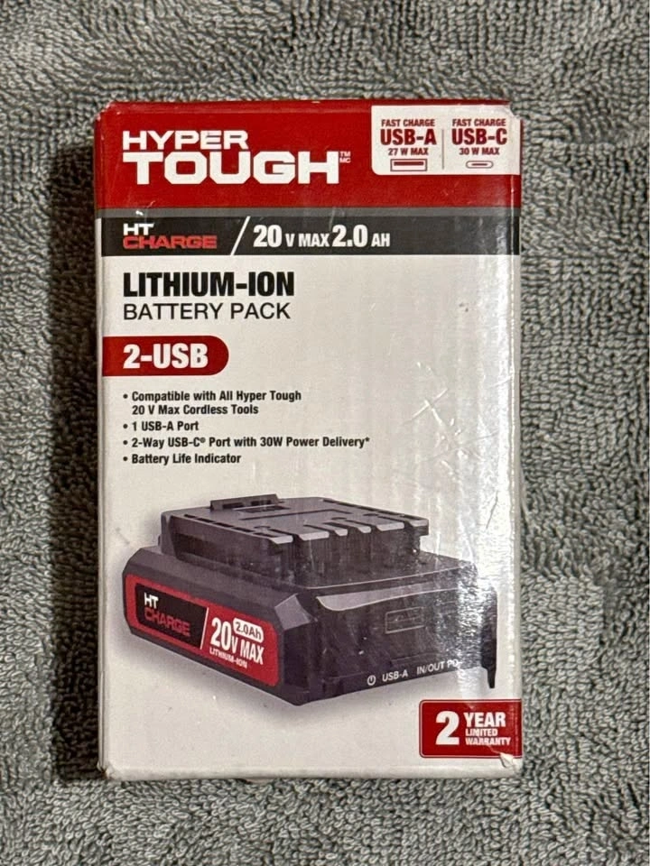 Selling a brand new Hyper Tough 20V Max 2.0 Ah Lithium-Ion Battery Pack! It's compatible with all Hyper Tough 20V Max cordless tools. Includes 1 USB-A port and a 2-way USB-C port with 30W Power Delivery. Features a battery life indicator. USB-A Output: 27W, 5V/3A, 9V/3A, 12V/ 2A. USB-C(PD) Input/Output: Max 30W, 5V/ 3A, 9V/3A, 12V/2.5A, 15V/2A, 20V/1.5A. Comes in the original box with a 2-year limited warranty.
