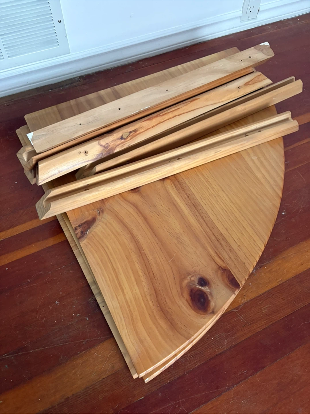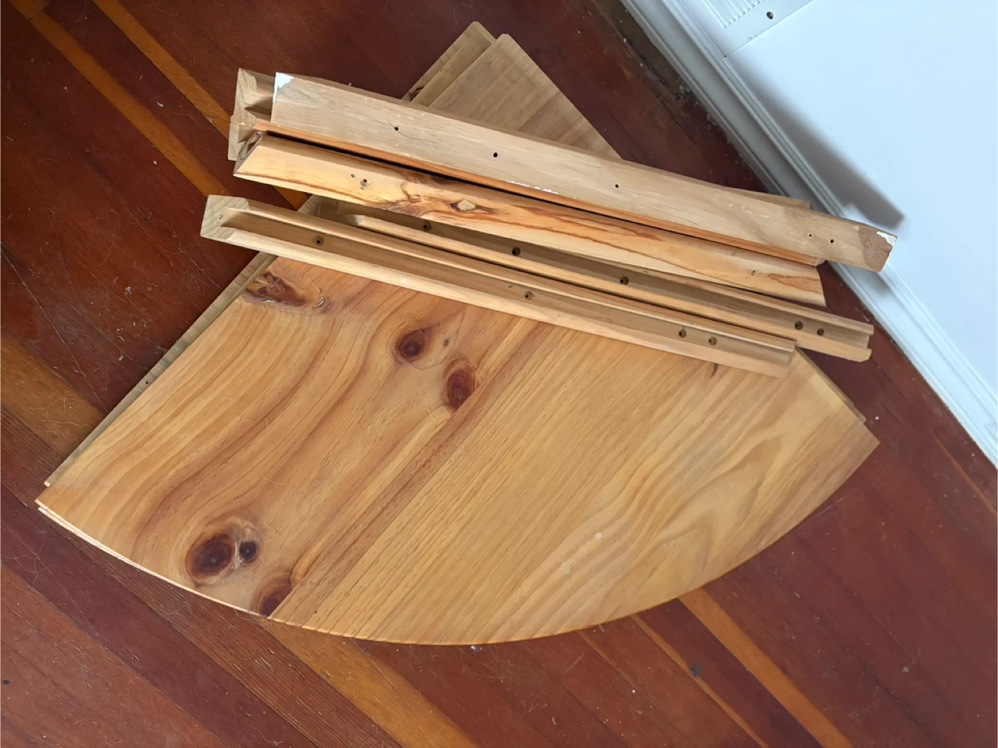 Wooden pieces for a corner shelf unit. Includes 3 large quarter-circle shelf and several support pieces. Made of pine wood. Already disassembled to sell! Trying to sell asap shoot me an offer!