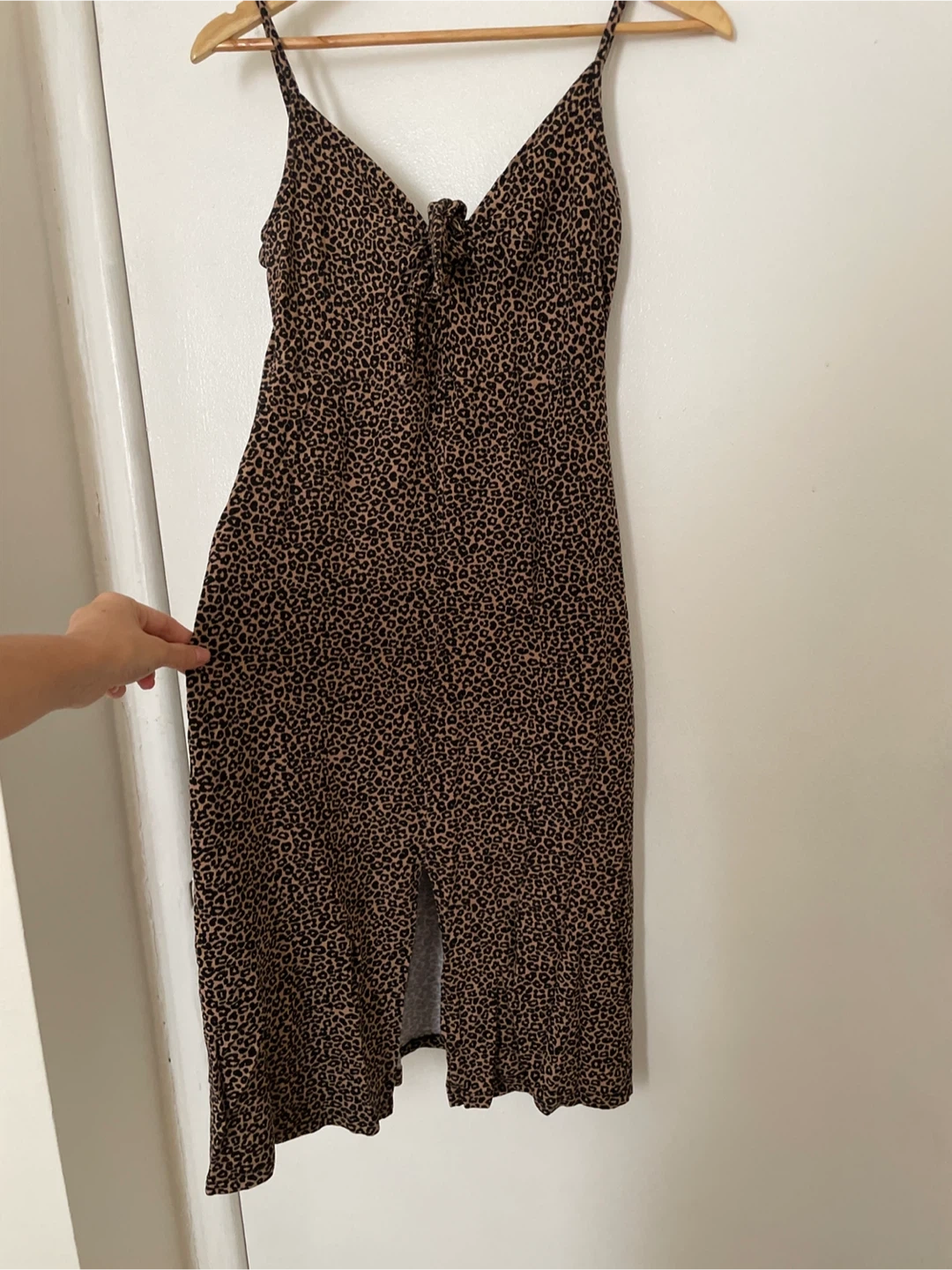 A stylish leopard print dress with thin straps and a tie-front detail. It has a V-neckline and a flattering cut. This piece is great for a night out or a casual summer day! Size Medium.