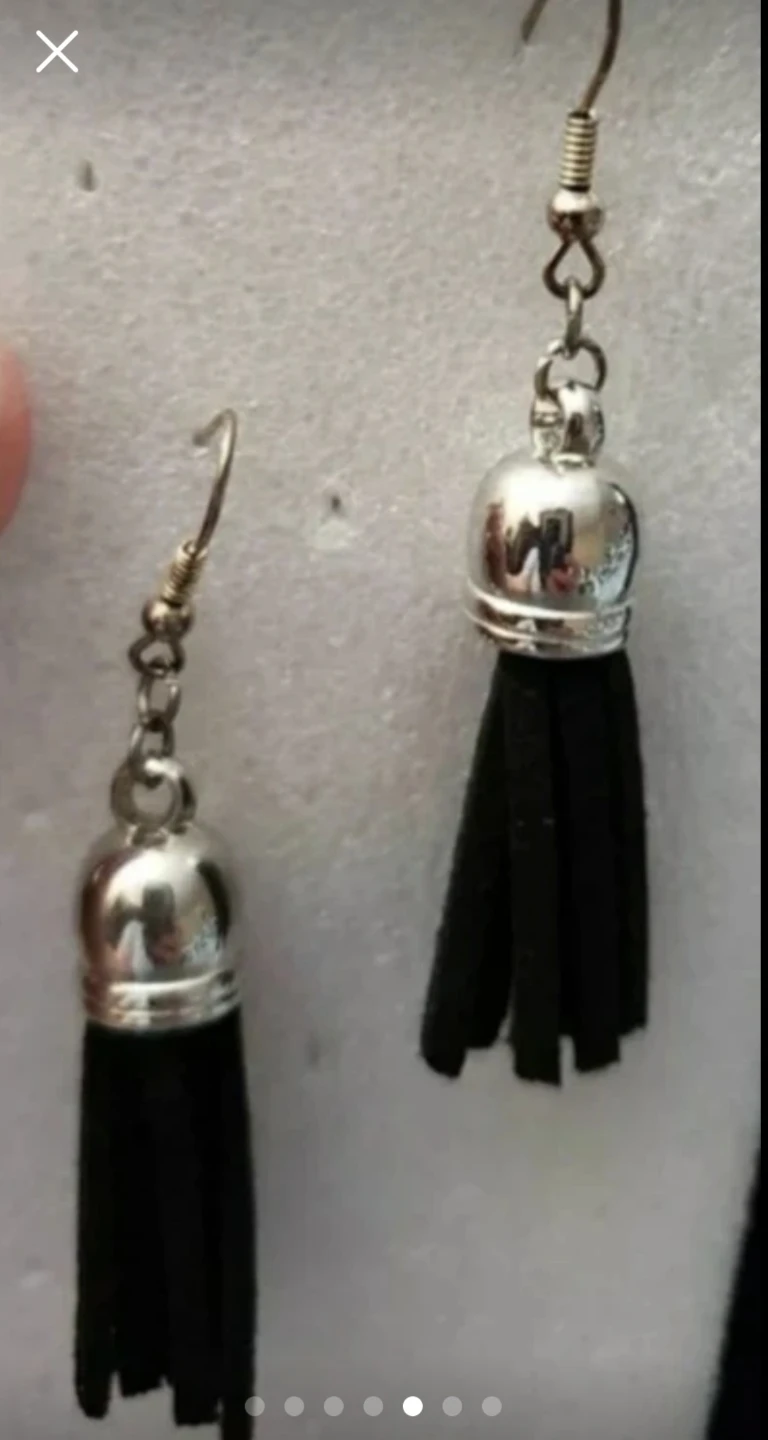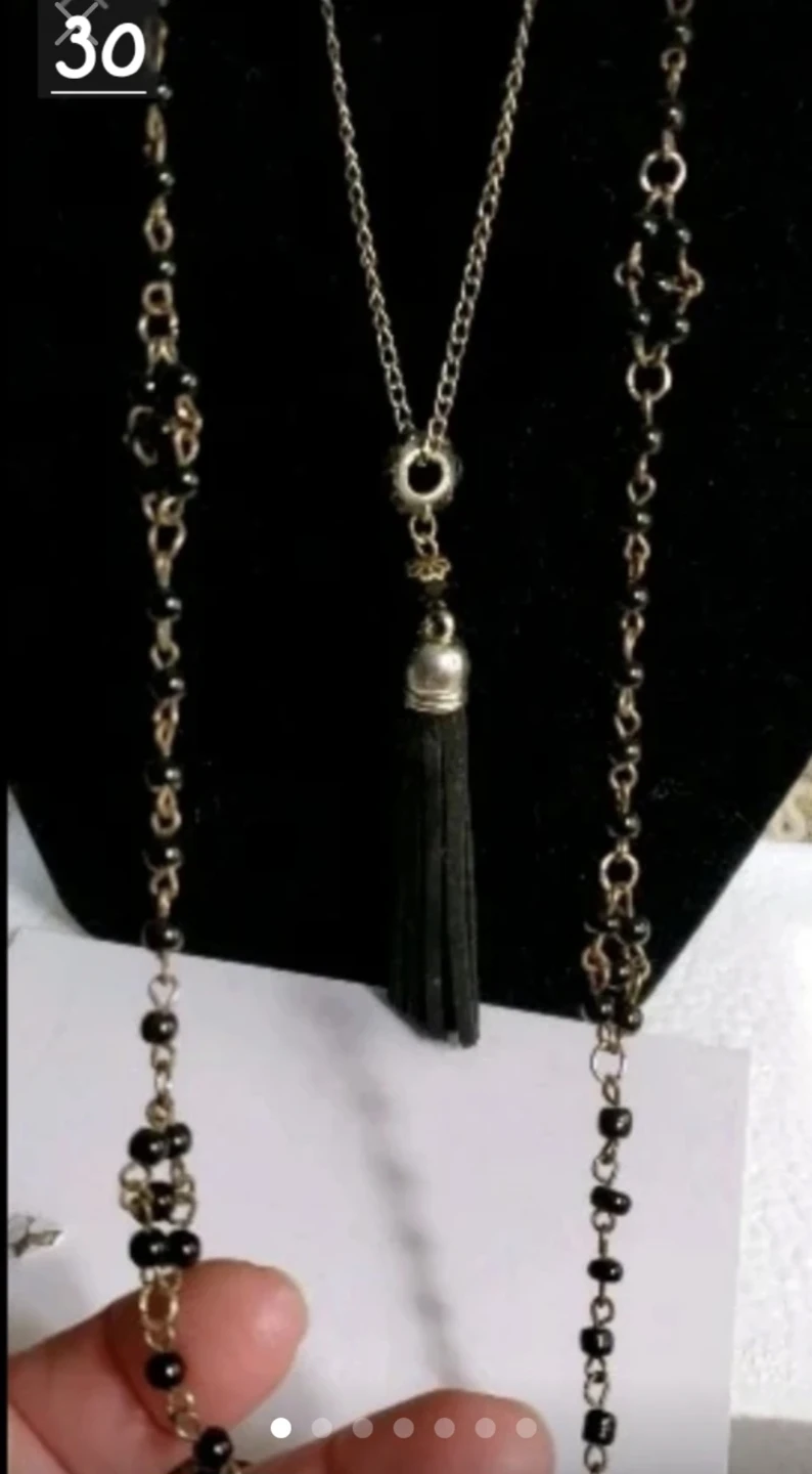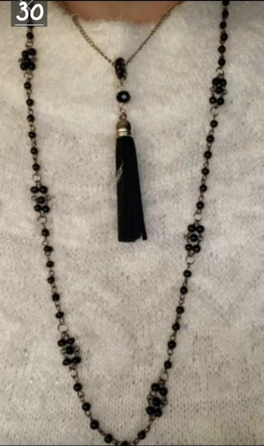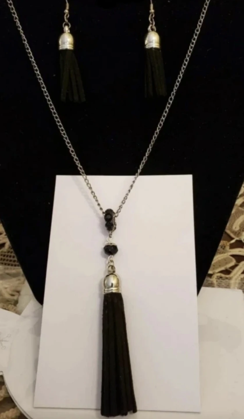 2 necklace and 1earring set! The necklace features a black tassel pendant and beaded chain. The earrings have a matching tassel design. Perfect for adding a touch of elegance to any outfit