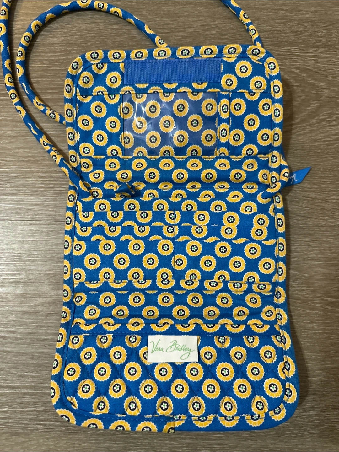 This Vera Bradley crossbody bag features a blue and yellow floral pattern. It has a zip pocket and a velcro closure. The interior has card slots and a clear window pocket.