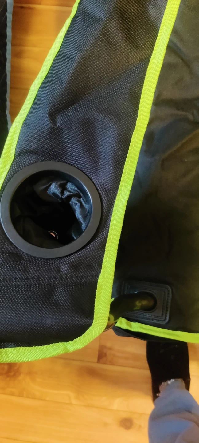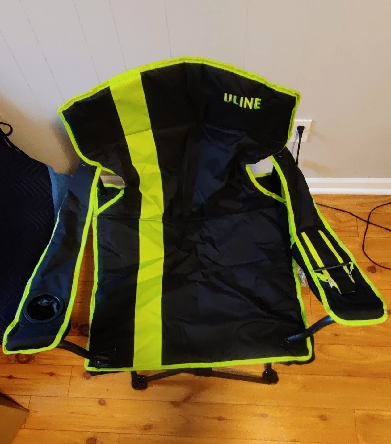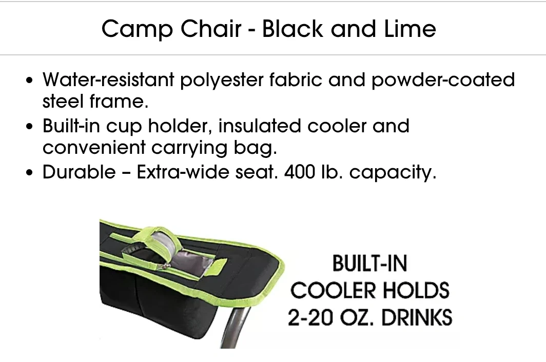 This Uline folding camp chair is black with bright green accents. It features a built-in cup holder on one armrest. It's made of durable fabric and has a sturdy metal frame. Includes a carrying bag for easy transport!