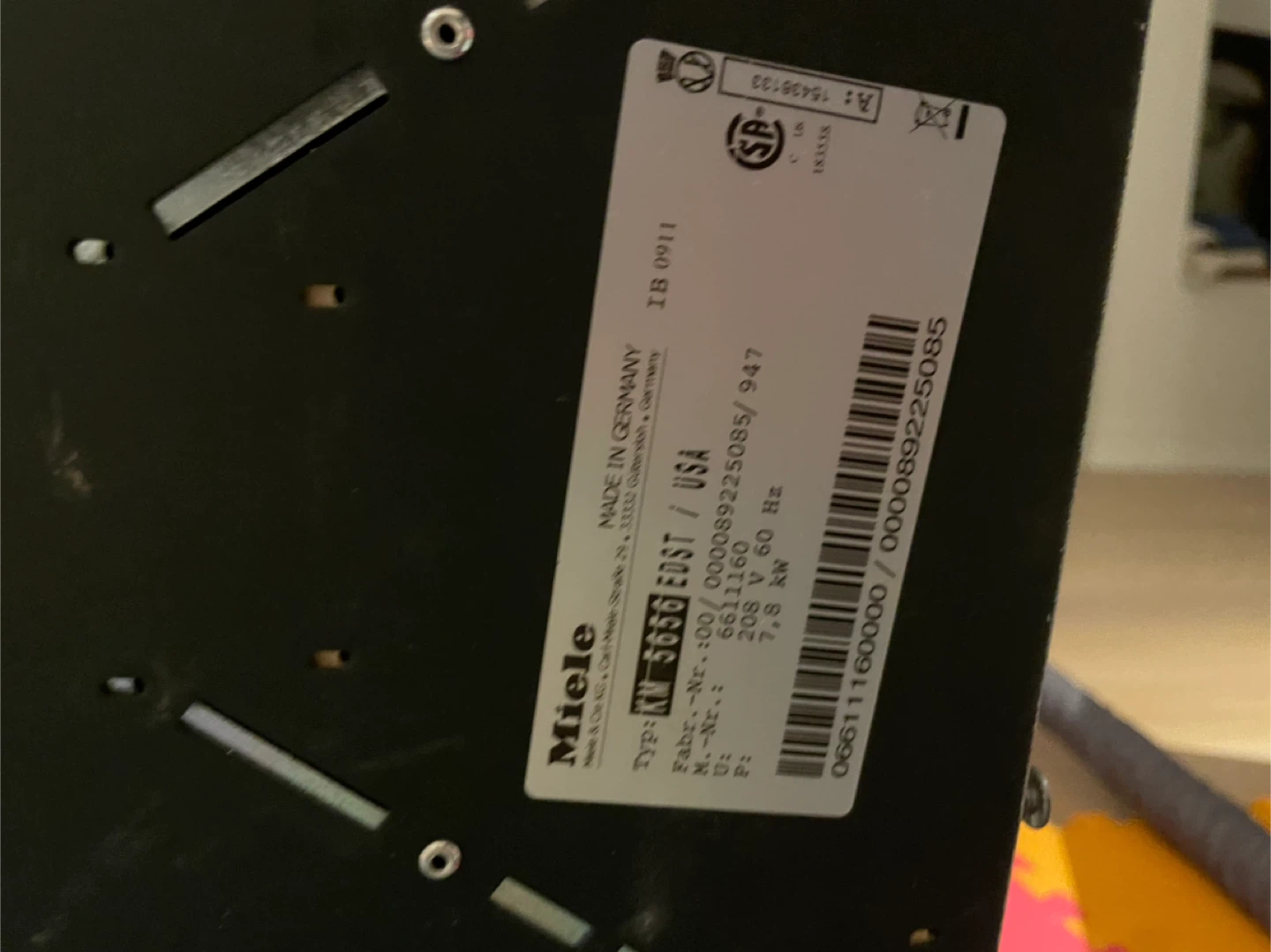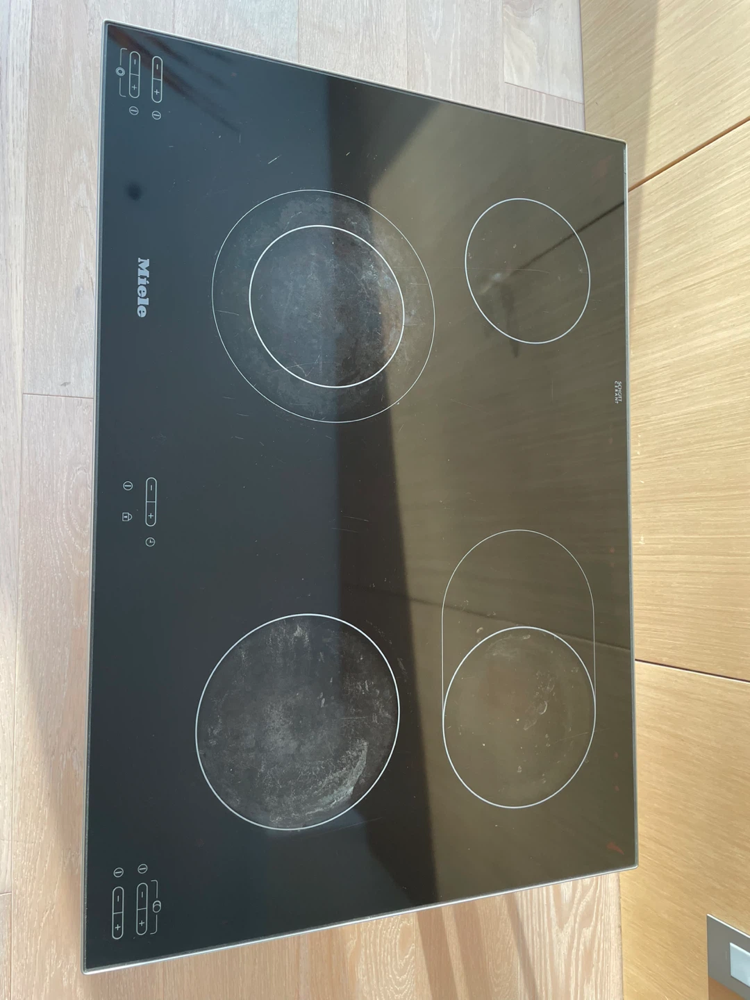 Miele KM 5656 EDST electric cooktop with four burners. Glass ceramic surface. The cooktop runs on 208 V and has a 7.8 kW power rating. Works perfectly fine, but has hard-to-remove stains.