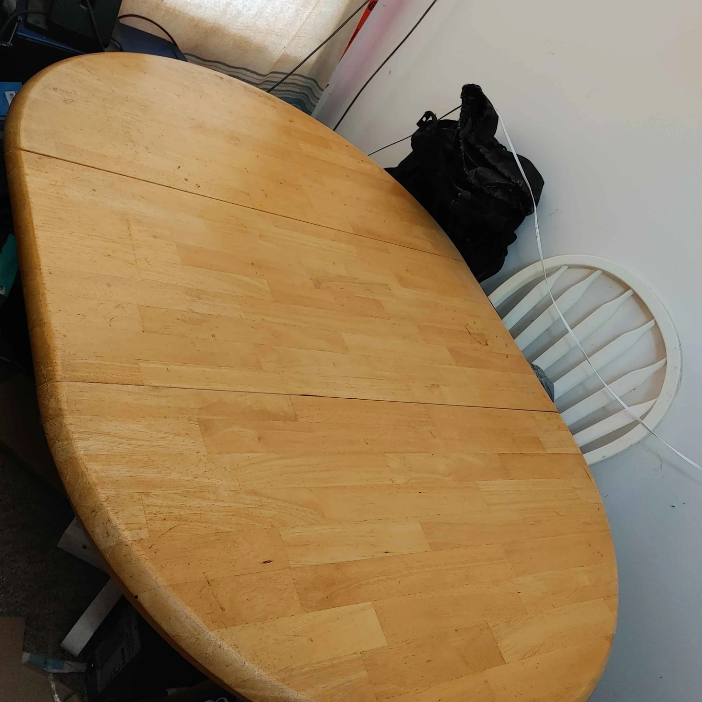 This is a light wood drop-leaf table. It's round when both leaves are down. It's constructed from Maple wood. Seats up to 6 people. Needs gone, never used it. Junk just piled on it. PICK UP ONLY. Cash or etransfer apon pick up.