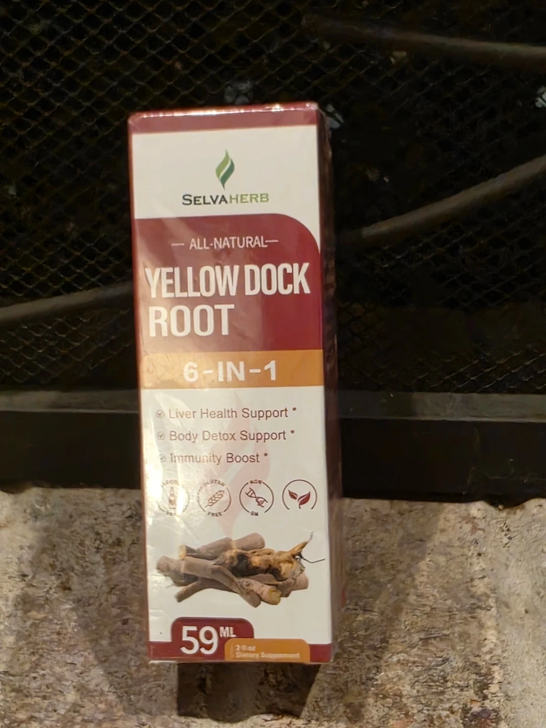 SelvaHerb Yellow Dock Root 6-in-1 supplement. Supports liver health, body detox, and immunity. 59ml volume. Dietary supplement.
