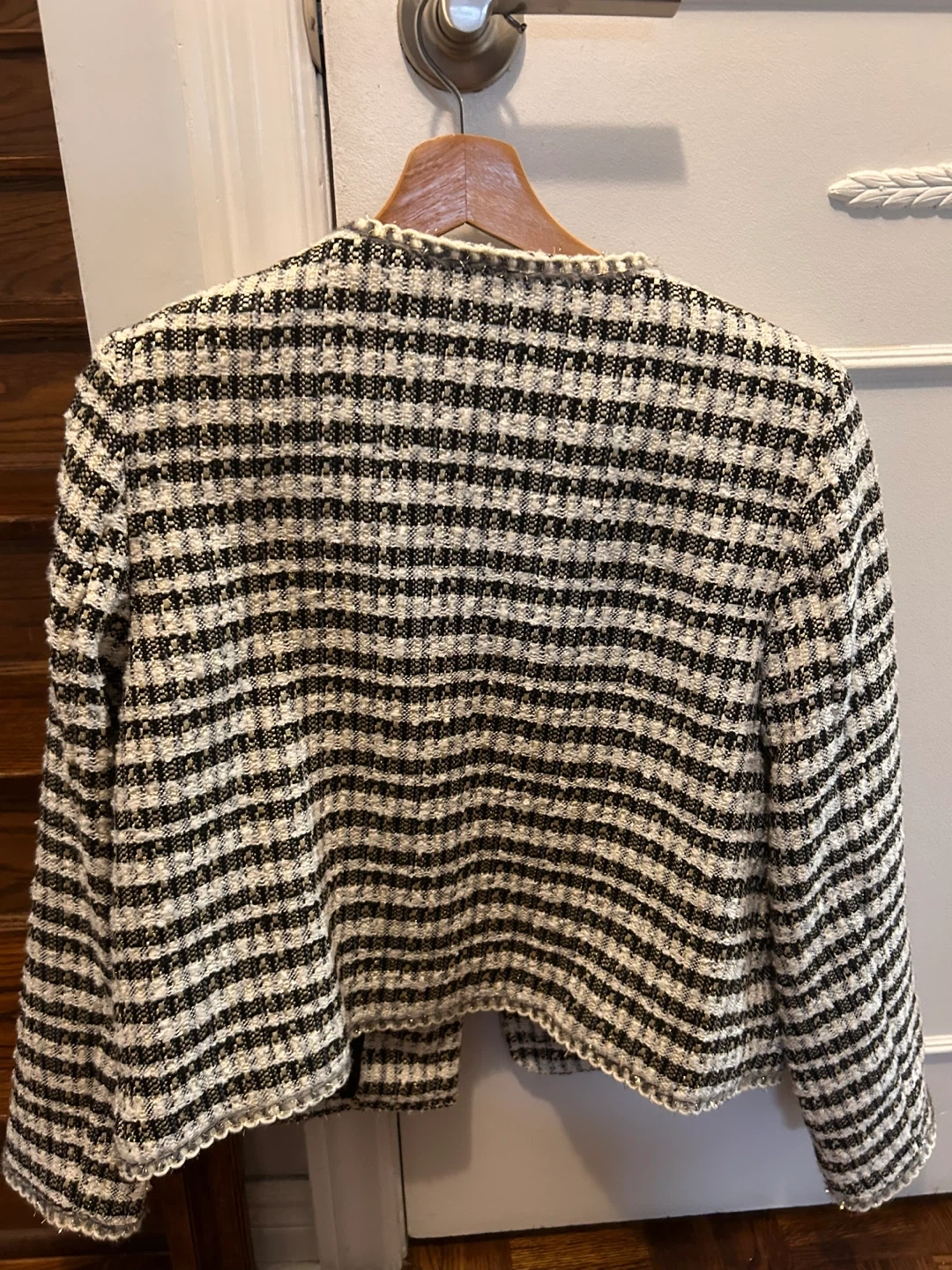 This H&M jacket features a classic black and white tweed pattern with metallic gold threads. It's a size L and has a decorative jeweled clasp closure. Great for layering over outfits!
