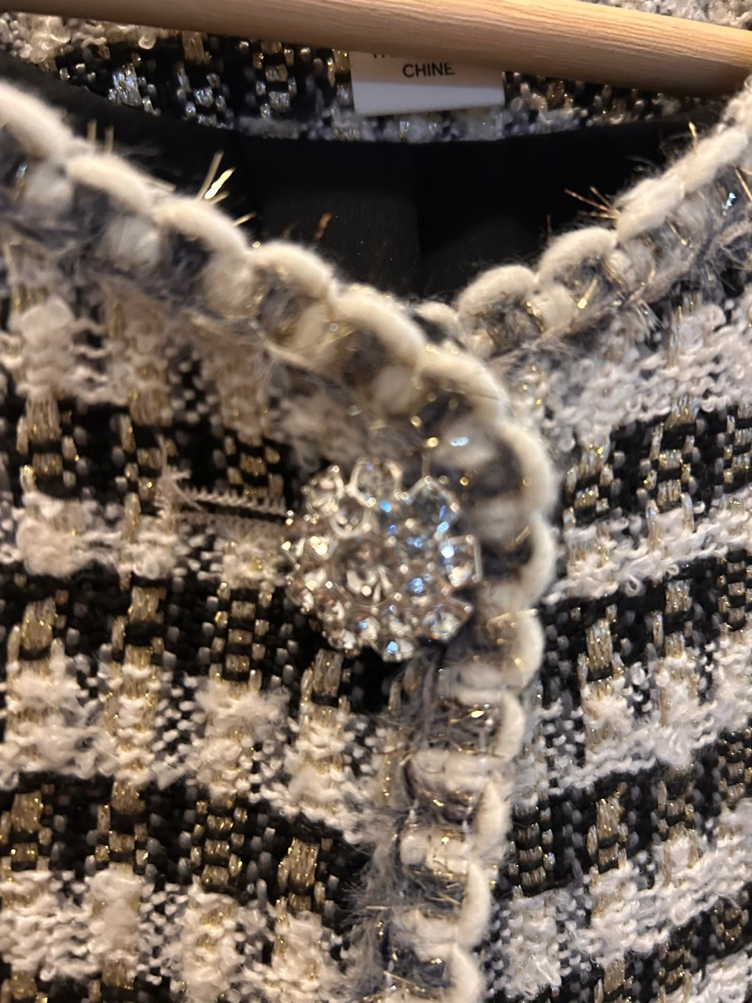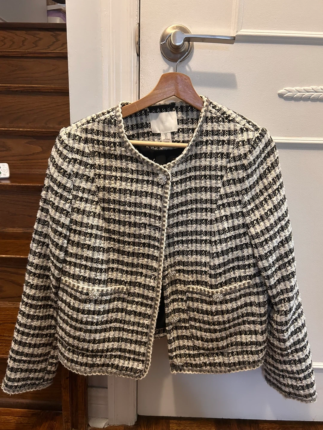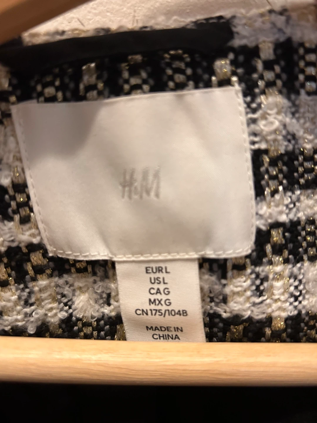 This H&M jacket features a classic black and white tweed pattern with metallic gold threads. It's a size L and has a decorative jeweled clasp closure. Great for layering over outfits!