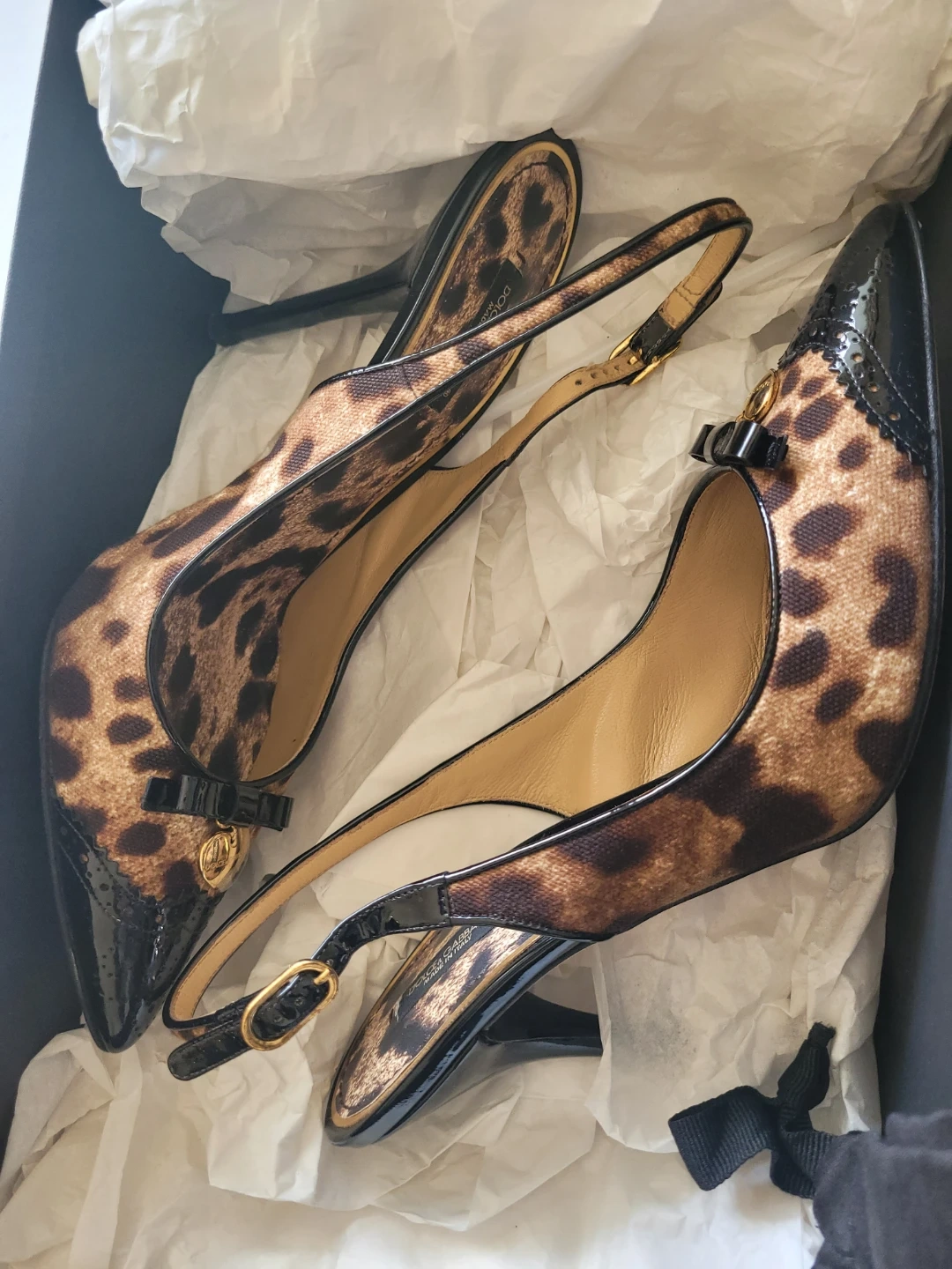 These Dolce & Gabbana slingback heels feature a classic leopard print with patent leather accents and a cute bow detail. Heel height is approximately 4 inches. Made in Italy. Comes with original box.