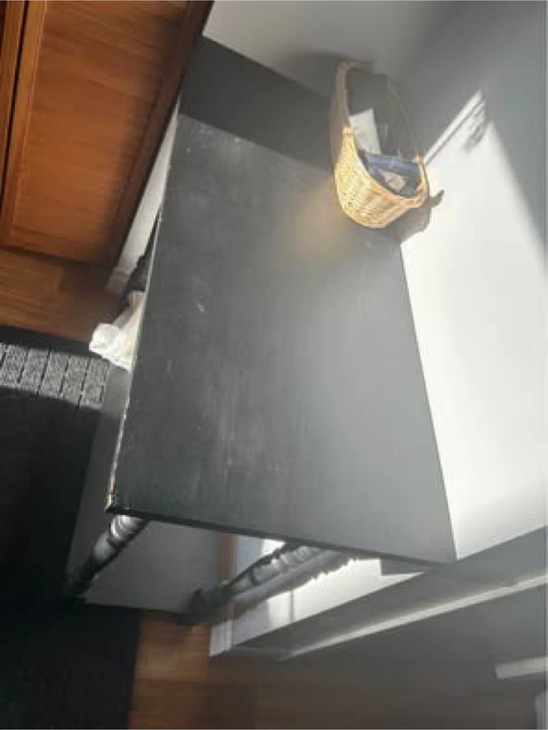 This is a black console table featuring decorative turned legs. It's made of wood with a matte black finish. It's a great size for hallways or entryways. Some minor scuffs are visible.