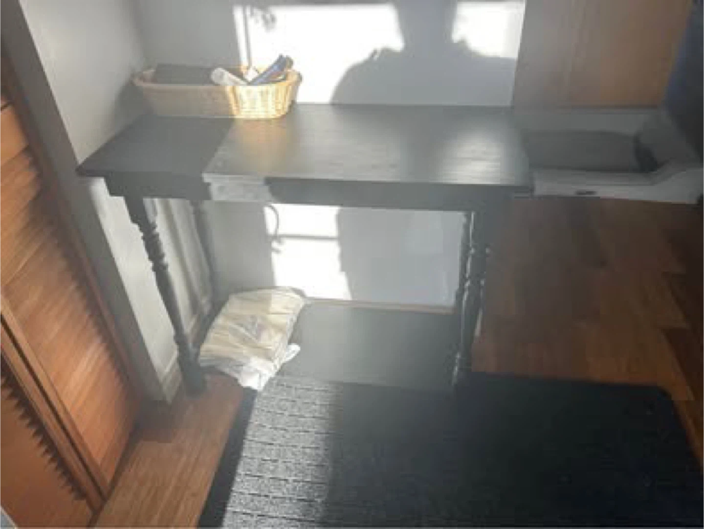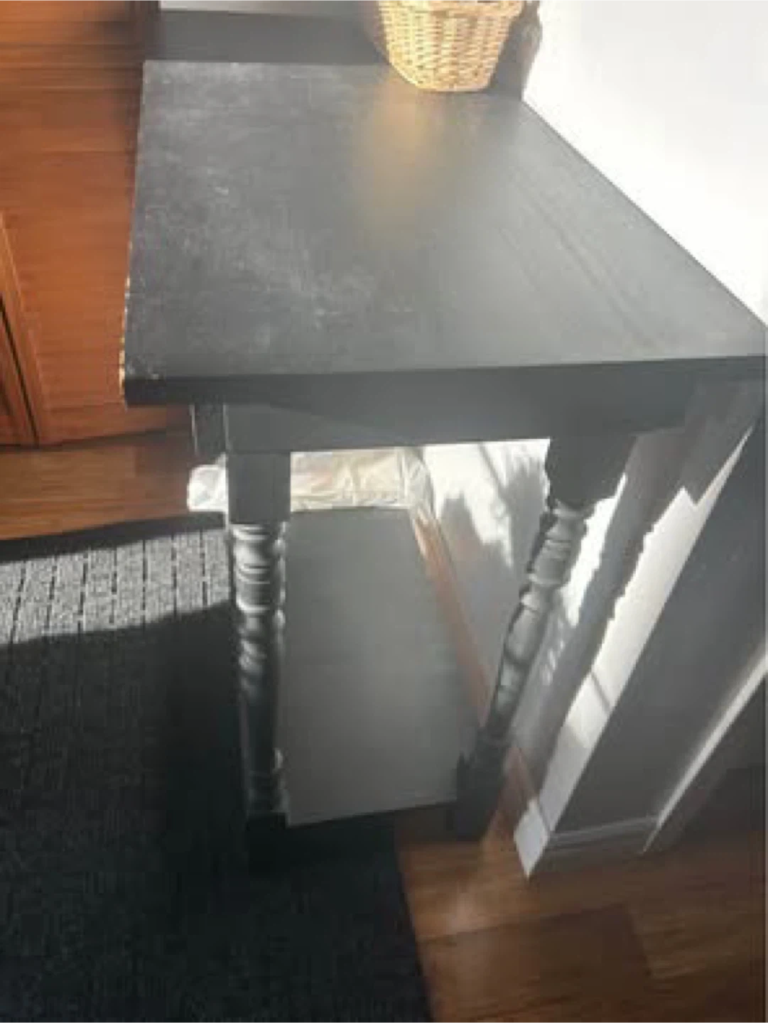This is a black console table featuring decorative turned legs. It's made of wood with a matte black finish. It's a great size for hallways or entryways. Some minor scuffs are visible.