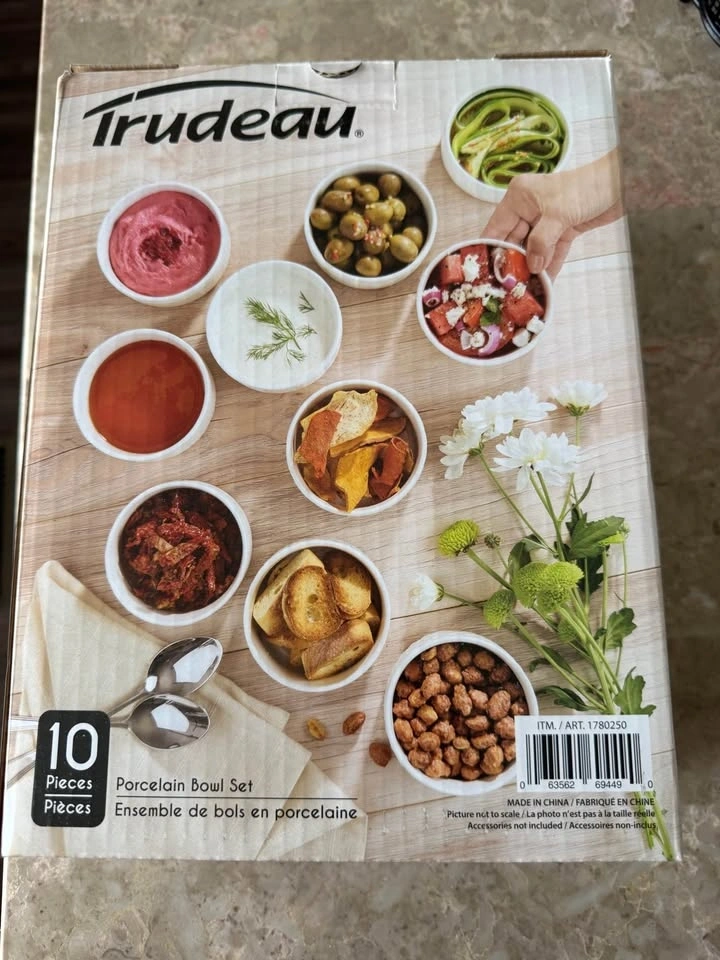 New Trudeau 10 piece porcelain bowl set. Has different textured patterns on the bowls. Great for serving dips, snacks, or small dishes.