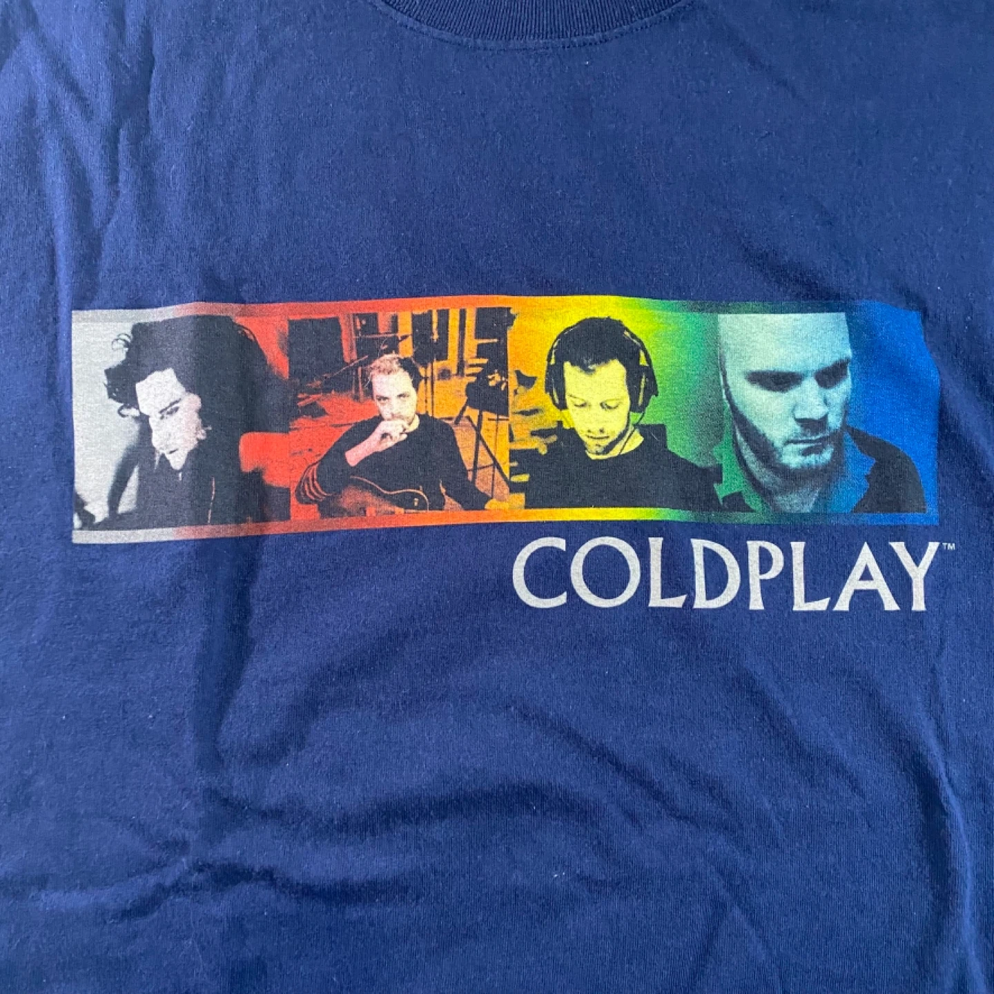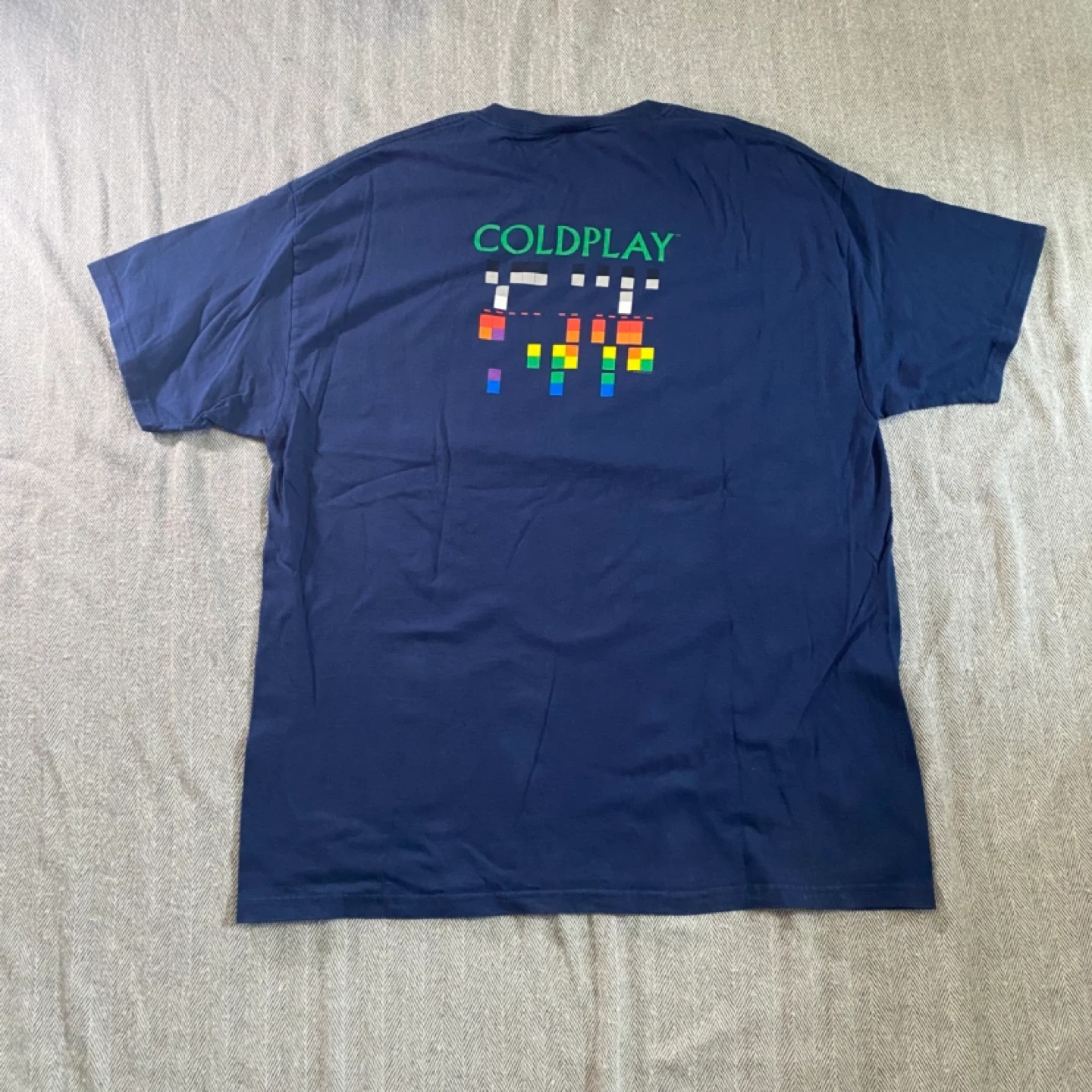 Navy blue t-shirt with a front graphic featuring the band members and the Coldplay logo from the early 2000’s. Back features a pixelated rainbow design and the Coldplay logo. Made with 100% premium cotton. A great shirt for any Coldplay fan! Size XL