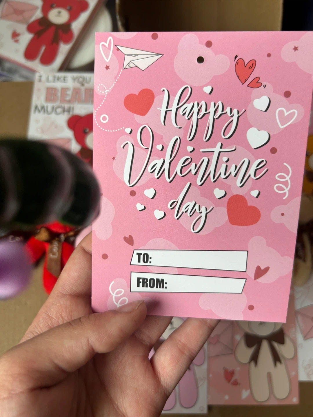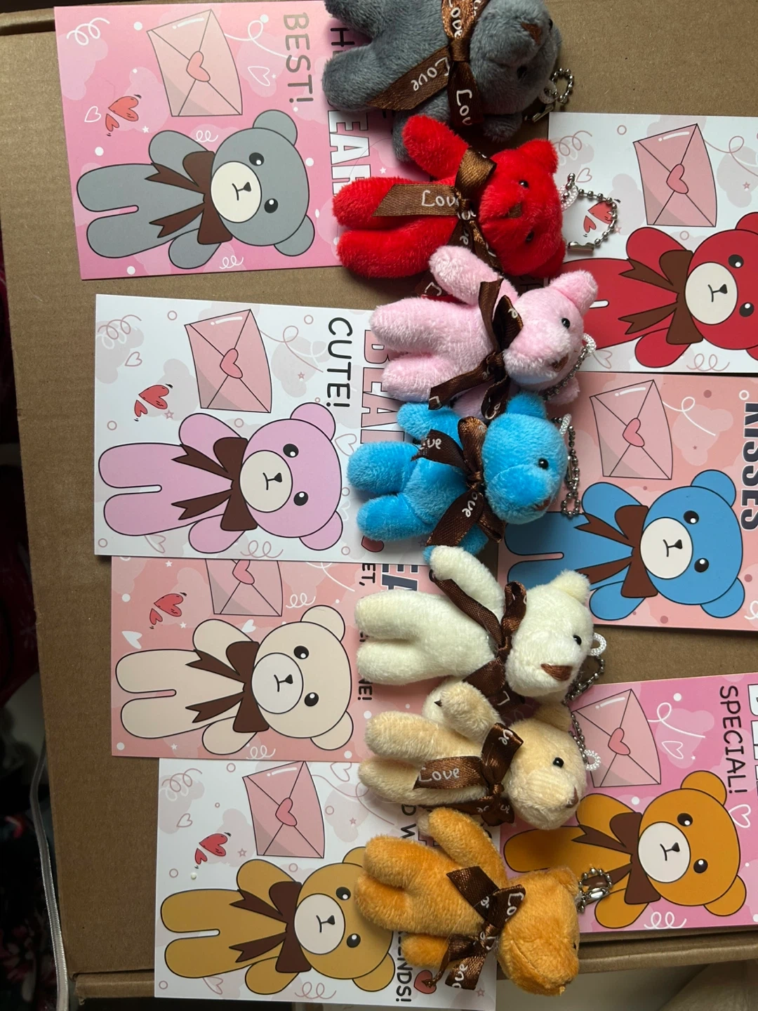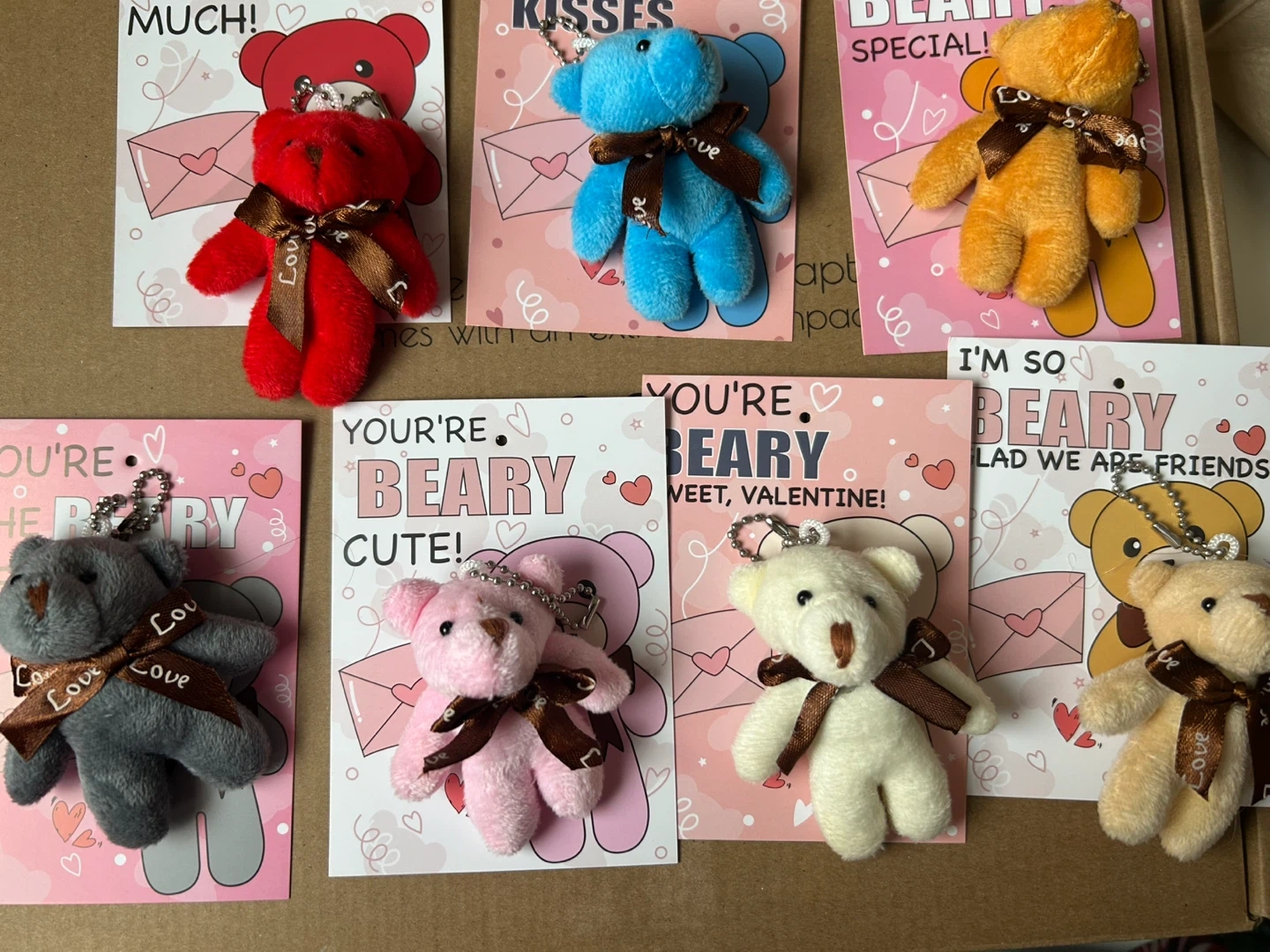 plush teddy bear keychains with Valentine's Day themed cards. Each bear is attached to a card with a sweet message, perfect for gifting. These are great little treats to give out!