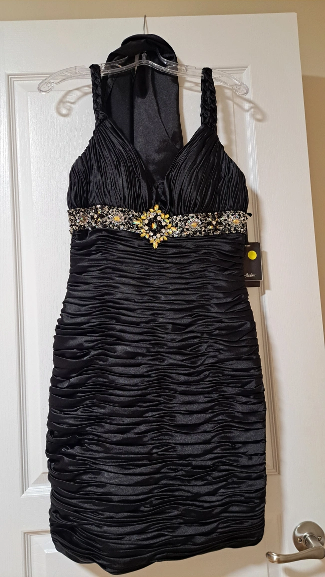 Selling a beautiful Jadore black dress with rhinestones , it also comes with a shawl size 10. It features a stylish design and is in great condition perfect for a wedding or any special occasion . The style number is T301. Originally bought for $150