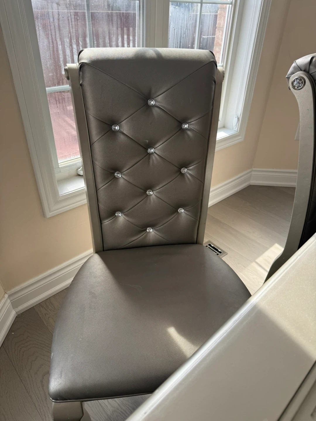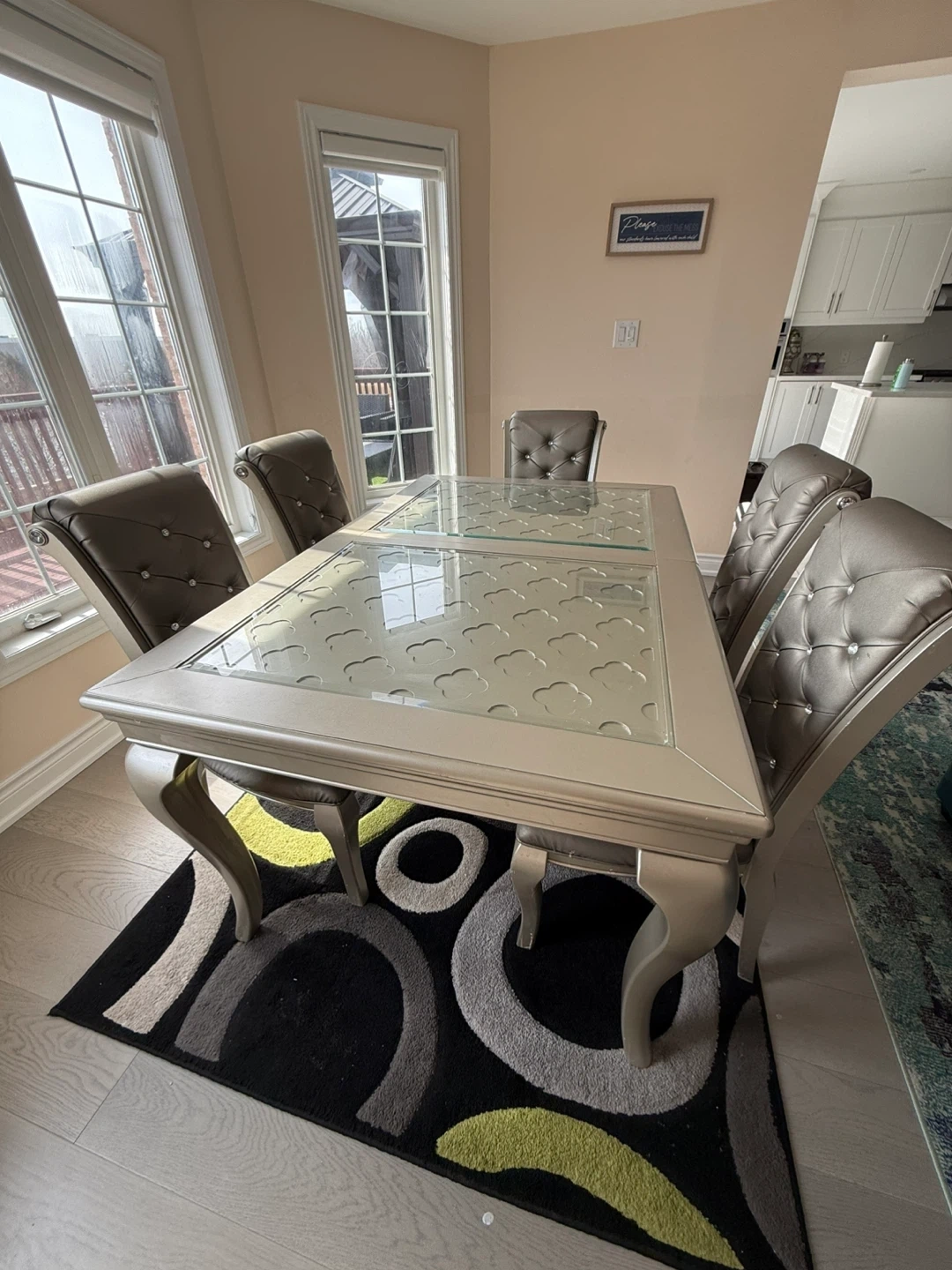 Includes a rectangular dining table with a glass top and six upholstered chairs. The chairs have tufted backs with crystal-like accents. This set's a great fit for your dining room!