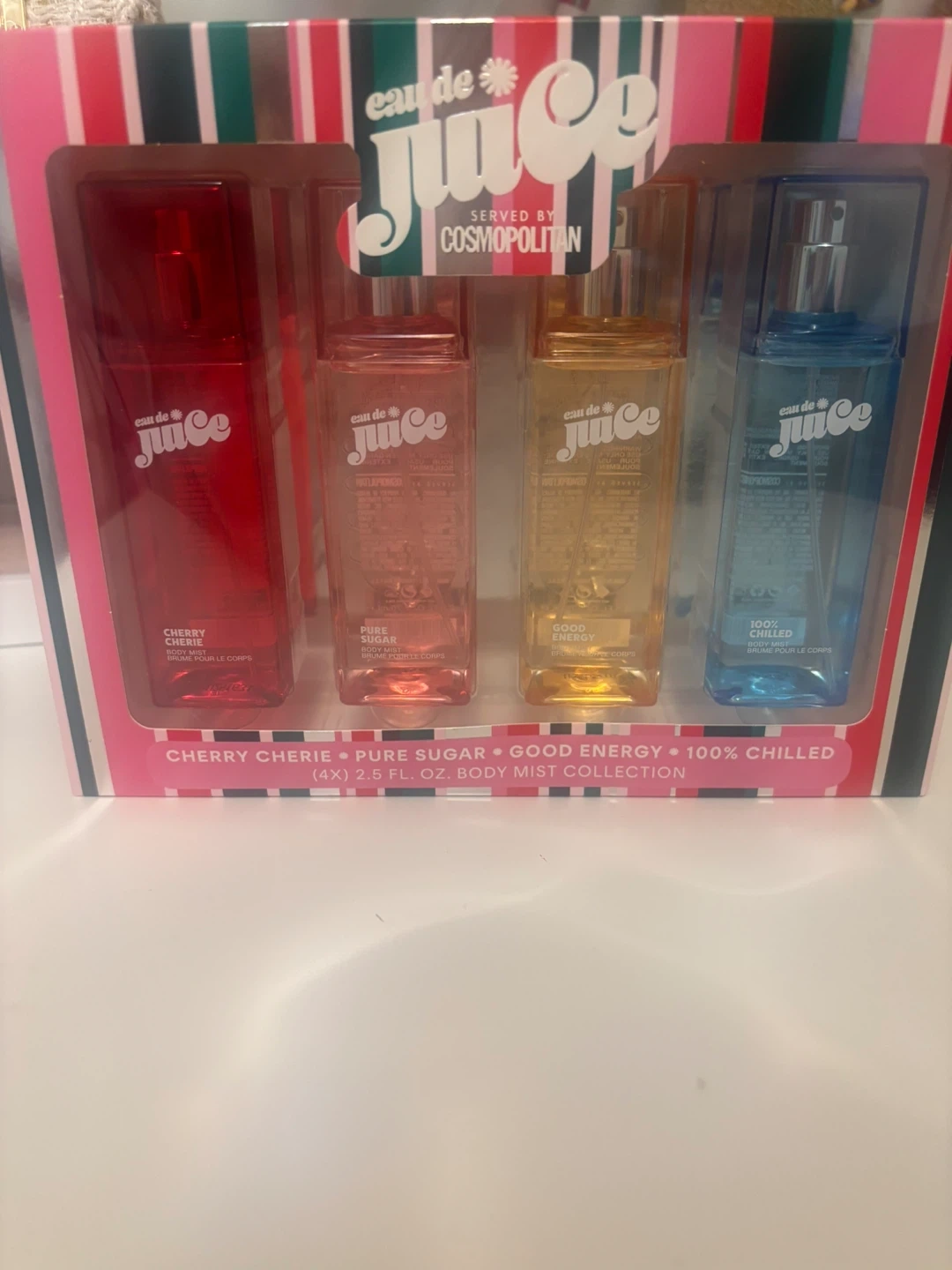 This brand new set includes four Eau de Juice body mists: Cherry Cherie, Pure Sugar, Good Energy, and 100% Chilled. Each mist is 2.5 fl. oz. or 75 ml. It's a great collection for trying different scents.