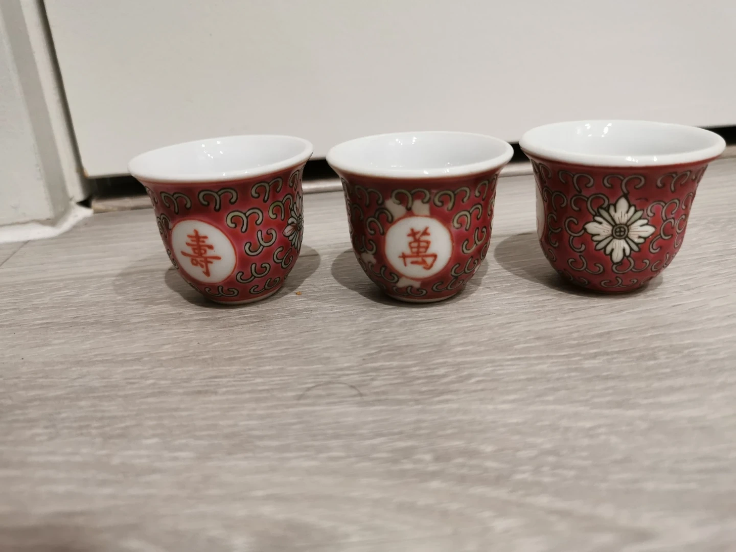 Here's a set of three little tea cups with Asian-style designs! They're red with white interiors, and each has a different character or flower design on the outside.